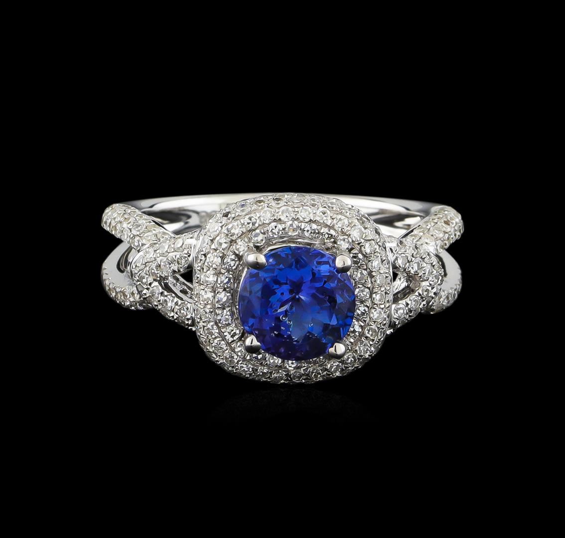 One electronically tested 14KT white gold ladies combination cast & assembled tanzanite and diamond ring with a split shank with a bright polish finish. Identified with markings of "14K". Condition is new. Containing: One prong set round modified brilliant cut natural tanzanite, measuring 6.99 - 6.99 x 4.76 mm, approximate weight of 1.56ct., clarity is eye clean, type I, medium light, moderately strong, violet color, (GIA V 4/4), cut is very good. Two Hundred Seventy-Five prong set single cut diamonds, measuring 1.00 - 1.00 x 0.60mm (depth est.) approximate total weight of 275 Stones = 1.08ct. Clarity: VS-2. Color: G, Cut is Good. Colored gemstones are presumed to have been subjected to commonly used enhancement processes. All diamonds and colored gemstones are graded in the mounting, unless otherwise stated. Total Weight of Colored Stones 1.56ct. Total Weight of Diamonds 1.08ct. Total Weight of Ring 5.60 grams. GGL Appraised at $6,890.00.
