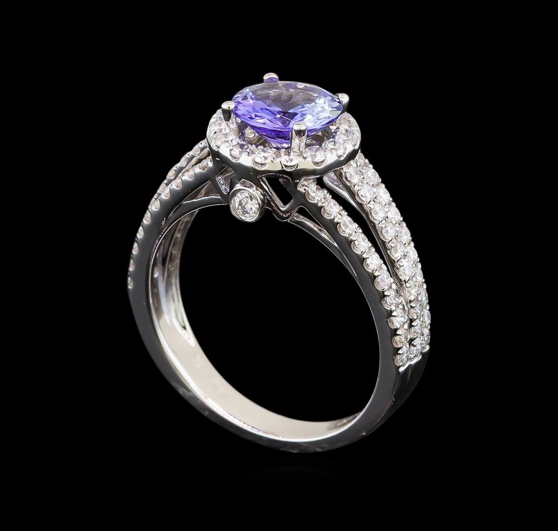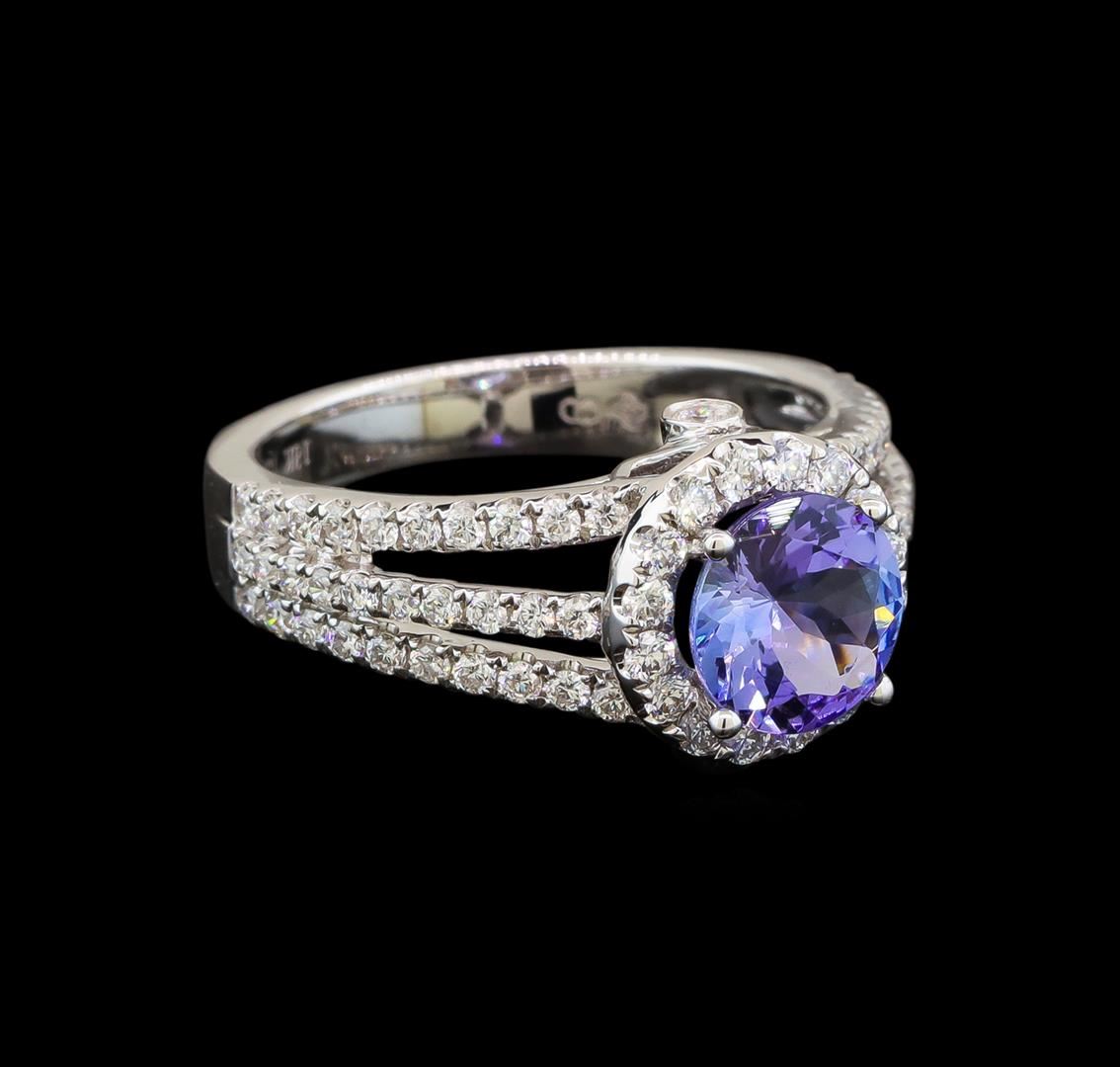 One electronically tested 14KT white gold ladies cast tanzanite and diamond ring with a bright polish finish. Identified with markings of "K14". Condition is new. Containing: One prong set round modified brilliant cut natural tanzanite, measuring 7.10 - 7.10 x 4.62 mm, approximate weight of 1.56ct., clarity is eye clean, type I, medium light, very slightly grayish, violet color, (GIA V 4/3), cut is good. Seventy-Eight prong set round brilliant cut diamonds, measuring 1.40 - 1.40 x 0.84mm (depth est.) approximate total weight of 78 Stones = 0.78ct. Clarity: SI-1 to SI-2. Color: H - I, Cut is Good. Colored gemstones are presumed to have been subjected to commonly used enhancement processes. All diamonds and colored gemstones are graded in the mounting, unless otherwise stated. Total Weight of Colored Stones 1.56ct. Total Weight of Diamonds 0.78ct. Total Weight of Ring 4.70 grams. GGL Appraised at $3,480.00.
