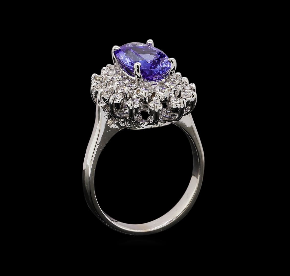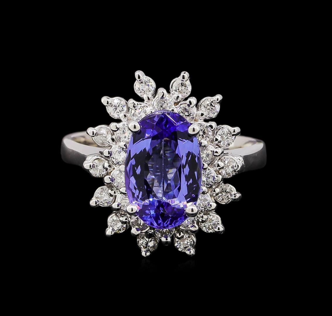 One electronically tested 14KT white gold ladies combination cast & assembled tanzanite and diamond ring with a bright polish finish. Identified with markings of "14K". Condition is new. Containing: One prong set oval modified brilliant cut natural tanzanite, measuring 10.30 x 6.70 x 3.21mm, approximate weight of 1.56ct., clarity is eye clean, type I, medium light, very slightly grayish, bluish violet color, (GIA bV 4/3), cut is good. Twenty-Eight prong set round brilliant cut diamonds, measuring 1.60 - 1.50 x 0.93mm (depth est.) approximate total weight of 28 Stones = 0.38ct. Clarity: SI-2 to I-1. Color: I - J, Cut is Good. Colored gemstones are presumed to have been subjected to commonly used enhancement processes. All diamonds and colored gemstones are graded in the mounting, unless otherwise stated. Total Weight of Colored Stones 1.56ct. Total Weight of Diamonds 0.38ct. Total Weight of Ring 5.40 grams. GGL Appraised at $3,880.00.