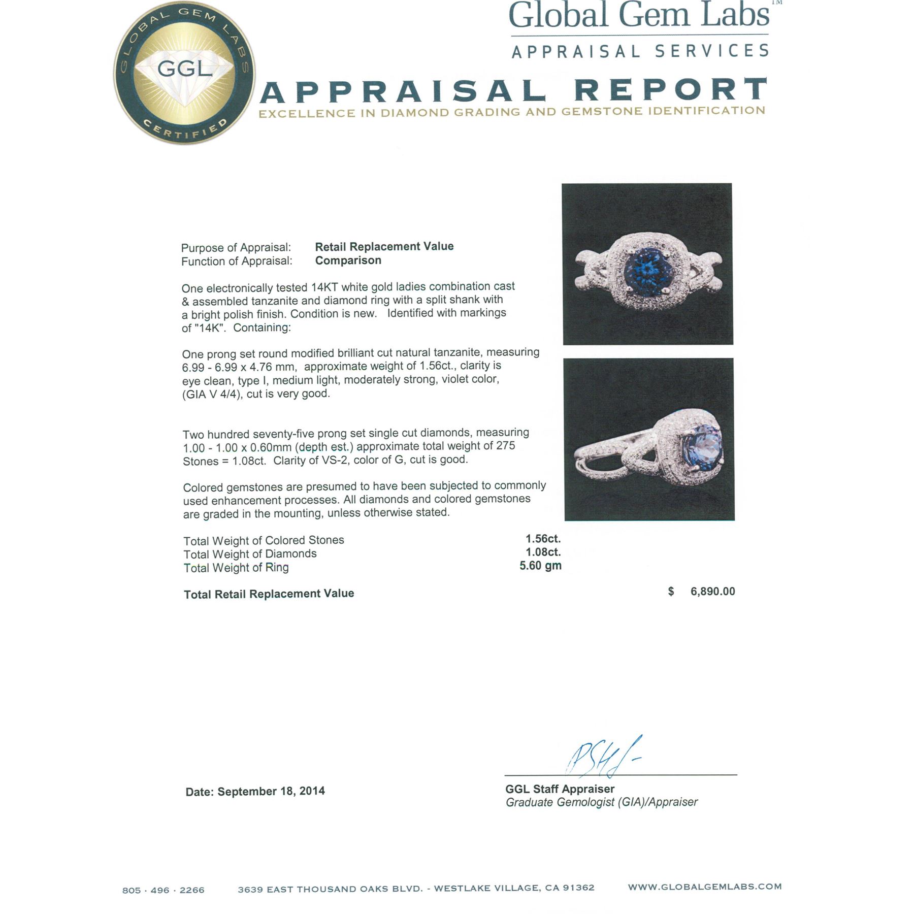 One electronically tested 14KT white gold ladies combination cast & assembled tanzanite and diamond ring with a split shank with a bright polish finish. Identified with markings of "14K". Condition is new. Containing: One prong set round modified brilliant cut natural tanzanite, measuring 6.99 - 6.99 x 4.76 mm, approximate weight of 1.56ct., clarity is eye clean, type I, medium light, moderately strong, violet color, (GIA V 4/4), cut is very good. Two Hundred Seventy-Five prong set single cut diamonds, measuring 1.00 - 1.00 x 0.60mm (depth est.) approximate total weight of 275 Stones = 1.08ct. Clarity: VS-2. Color: G, Cut is Good. Colored gemstones are presumed to have been subjected to commonly used enhancement processes. All diamonds and colored gemstones are graded in the mounting, unless otherwise stated. Total Weight of Colored Stones 1.56ct. Total Weight of Diamonds 1.08ct. Total Weight of Ring 5.60 grams. GGL Appraised at $6,890.00.