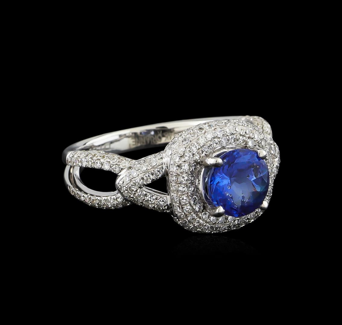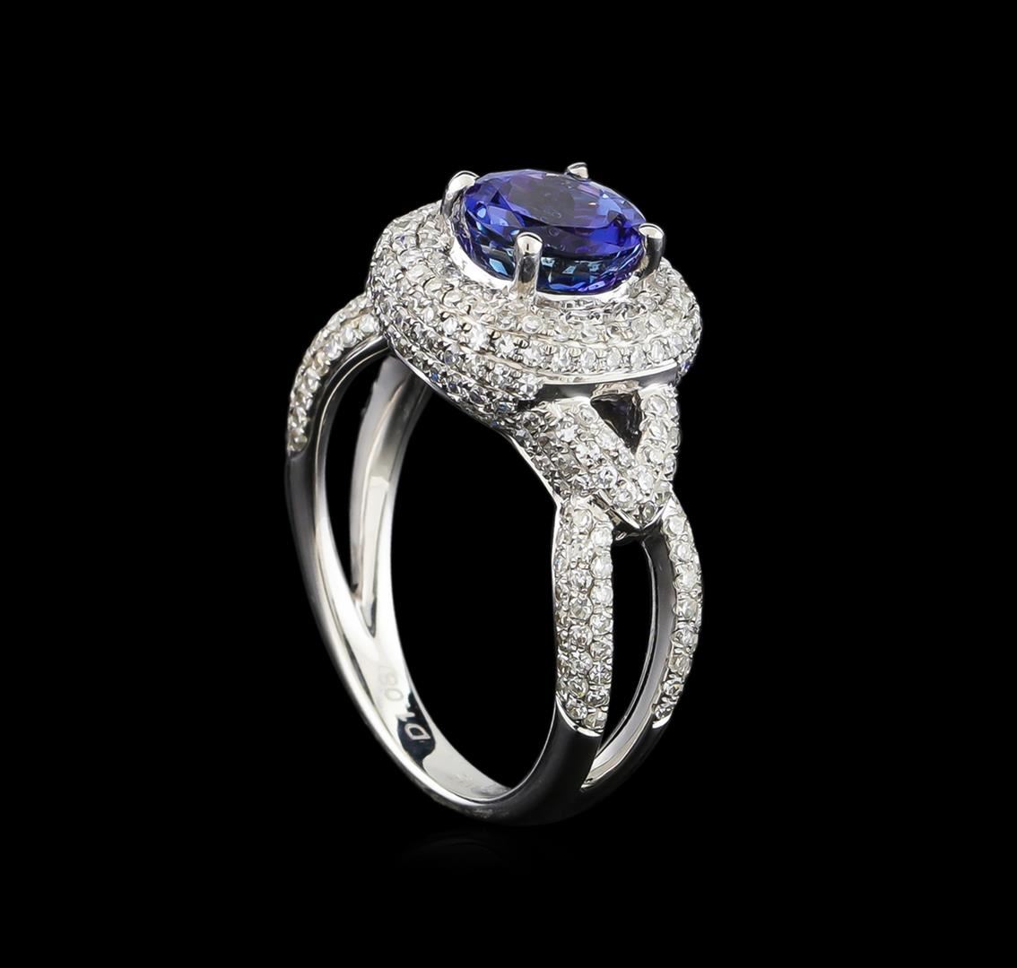 One electronically tested 14KT white gold ladies combination cast & assembled tanzanite and diamond ring with a split shank with a bright polish finish. Identified with markings of "14K". Condition is new. Containing: One prong set round modified brilliant cut natural tanzanite, measuring 6.99 - 6.99 x 4.76 mm, approximate weight of 1.56ct., clarity is eye clean, type I, medium light, moderately strong, violet color, (GIA V 4/4), cut is very good. Two Hundred Seventy-Five prong set single cut diamonds, measuring 1.00 - 1.00 x 0.60mm (depth est.) approximate total weight of 275 Stones = 1.08ct. Clarity: VS-2. Color: G, Cut is Good. Colored gemstones are presumed to have been subjected to commonly used enhancement processes. All diamonds and colored gemstones are graded in the mounting, unless otherwise stated. Total Weight of Colored Stones 1.56ct. Total Weight of Diamonds 1.08ct. Total Weight of Ring 5.60 grams. GGL Appraised.