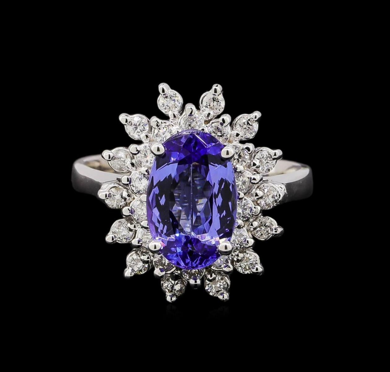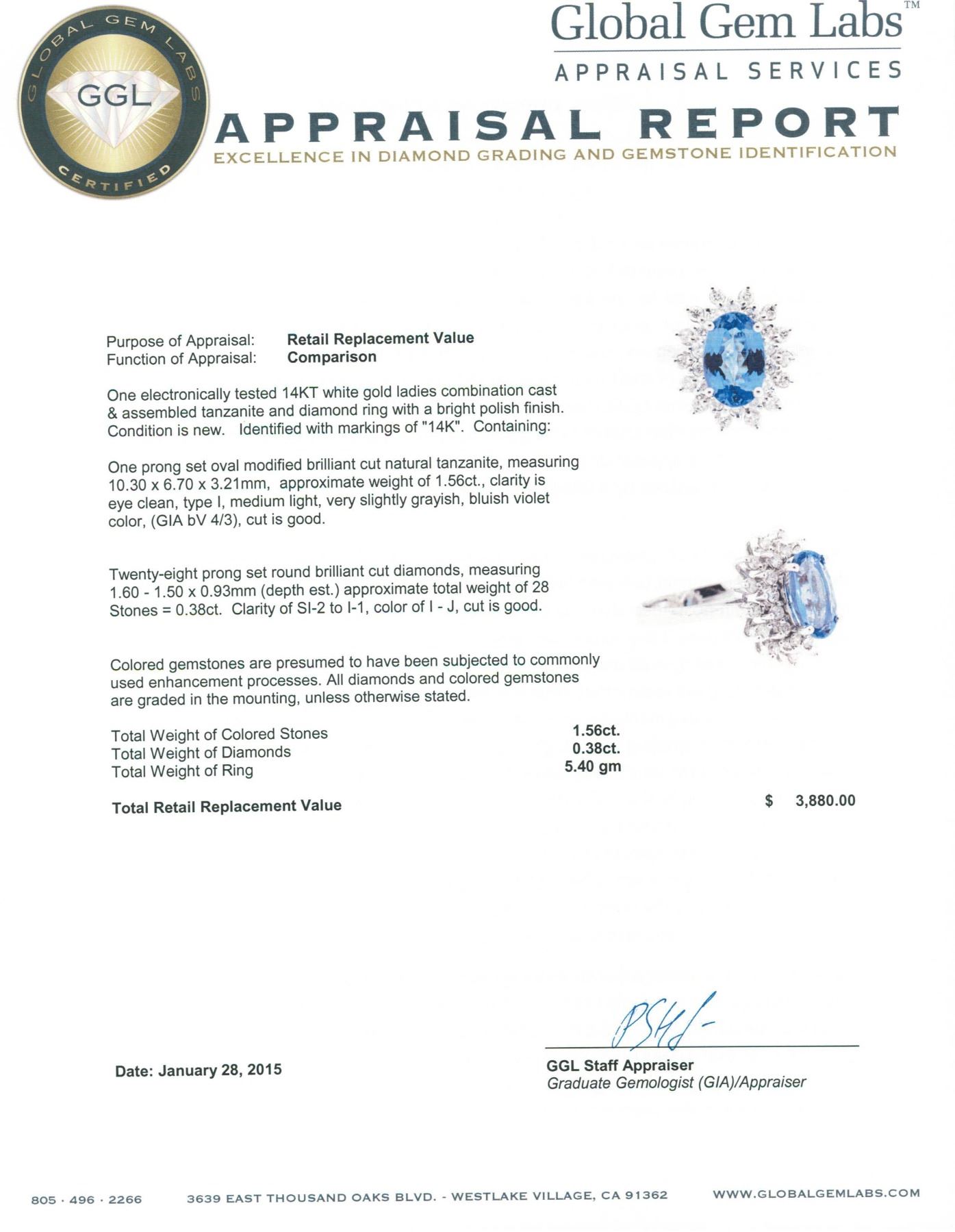 One electronically tested 14KT white gold ladies combination cast & assembled tanzanite and diamond ring with a bright polish finish. Identified with markings of "14K". Condition is new. Containing: One prong set oval modified brilliant cut natural tanzanite, measuring 10.30 x 6.70 x 3.21mm, approximate weight of 1.56ct., clarity is eye clean, type I, medium light, very slightly grayish, bluish violet color, (GIA bV 4/3), cut is good. Twenty-Eight prong set round brilliant cut diamonds, measuring 1.60 - 1.50 x 0.93mm (depth est.) approximate total weight of 28 Stones = 0.38ct. Clarity: SI-2 to I-1. Color: I - J, Cut is Good. Colored gemstones are presumed to have been subjected to commonly used enhancement processes. All diamonds and colored gemstones are graded in the mounting, unless otherwise stated. Total Weight of Colored Stones 1.56ct. Total Weight of Diamonds 0.38ct. Total Weight of Ring 5.40 grams. GGL Appraised.