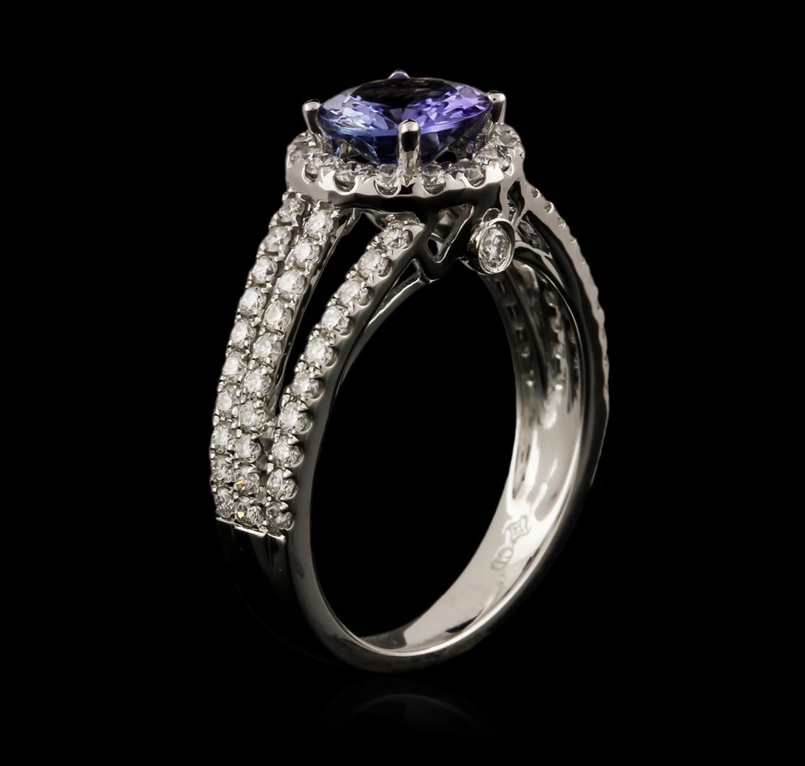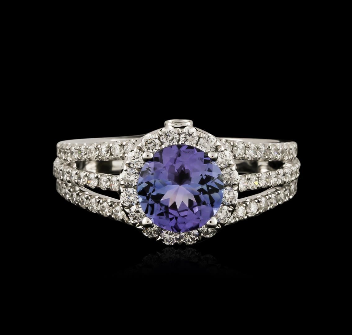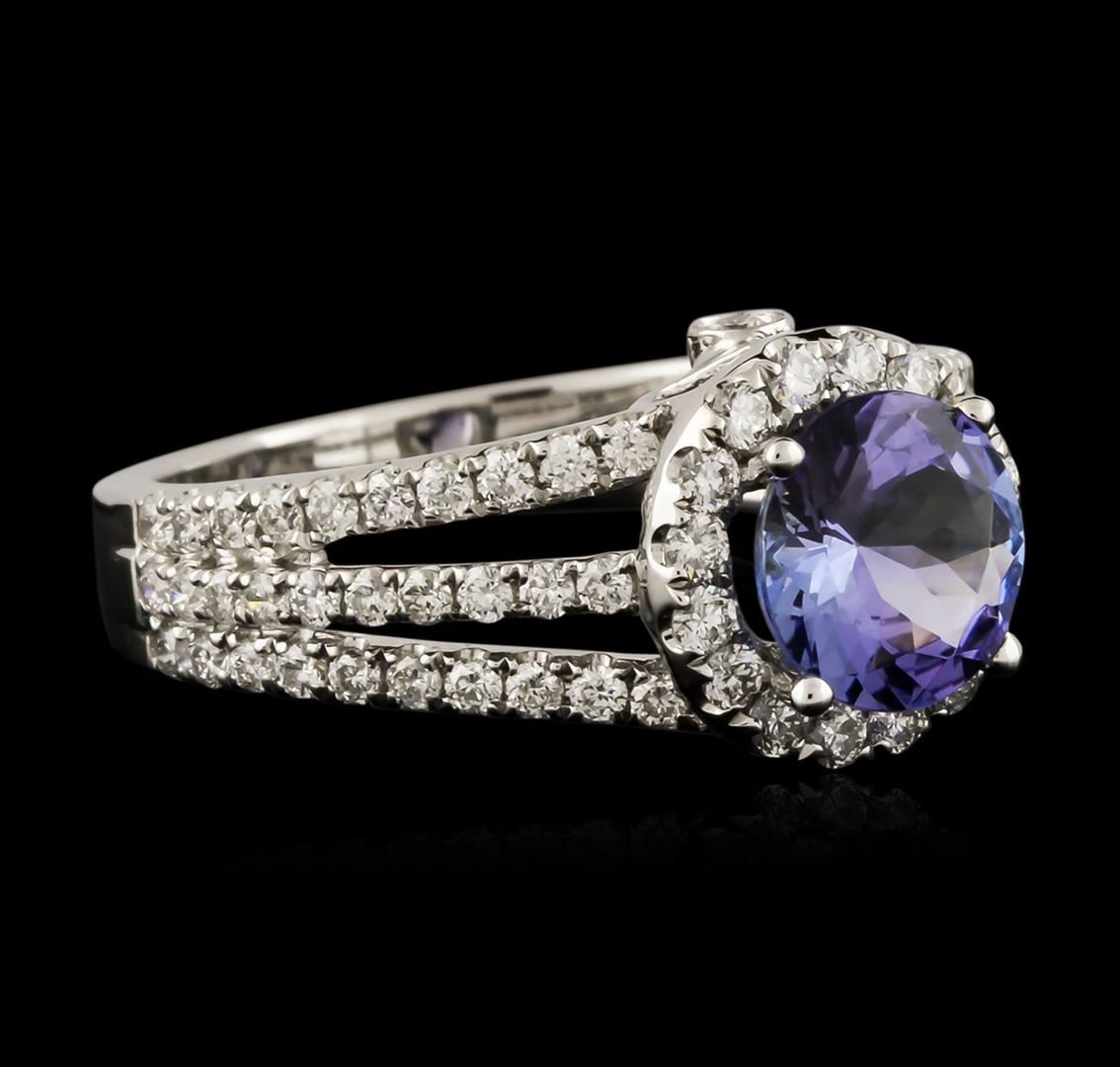 One electronically tested 14KT white gold ladies cast tanzanite and diamond ring with a bright polish finish. Identified with markings of "K14". Condition is new. Containing: One prong set round modified brilliant cut natural tanzanite, measuring 7.10 - 7.10 x 4.62 mm, approximate weight of 1.56ct., clarity is eye clean, type I, medium light, very slightly grayish, violet color, (GIA V 4/3), cut is good. Seventy-Eight prong set round brilliant cut diamonds, measuring 1.40 - 1.40 x 0.84mm (depth est.) approximate total weight of 78 Stones = 0.78ct. Clarity: SI-1 to SI-2. Color: H - I, Cut is Good. Colored gemstones are presumed to have been subjected to commonly used enhancement processes. All diamonds and colored gemstones are graded in the mounting, unless otherwise stated. Total Weight of Colored Stones 1.56ct. Total Weight of Diamonds 0.78ct. Total Weight of Ring 4.70 grams. GGL Appraised at $3,480.00.
