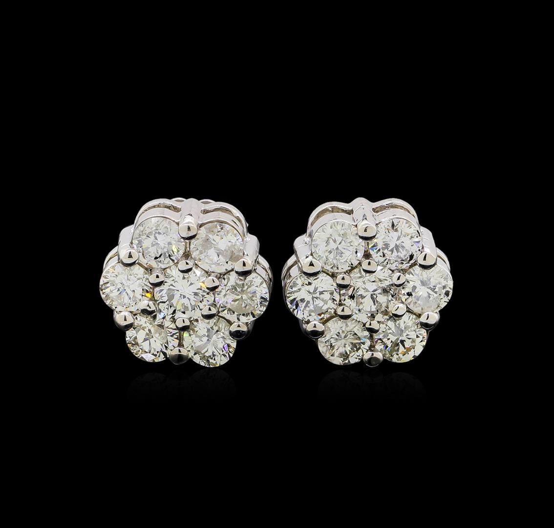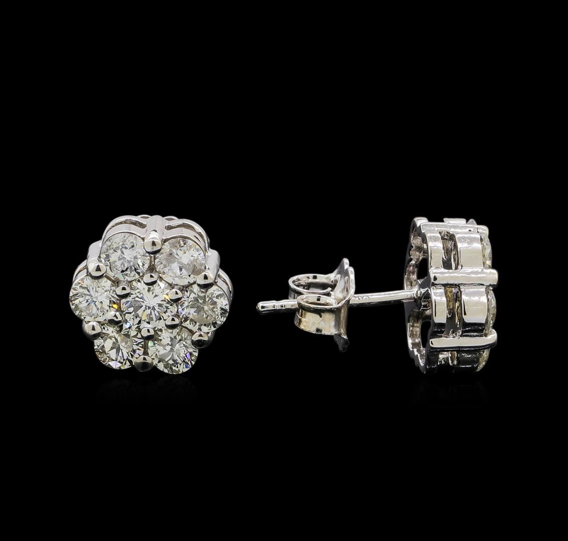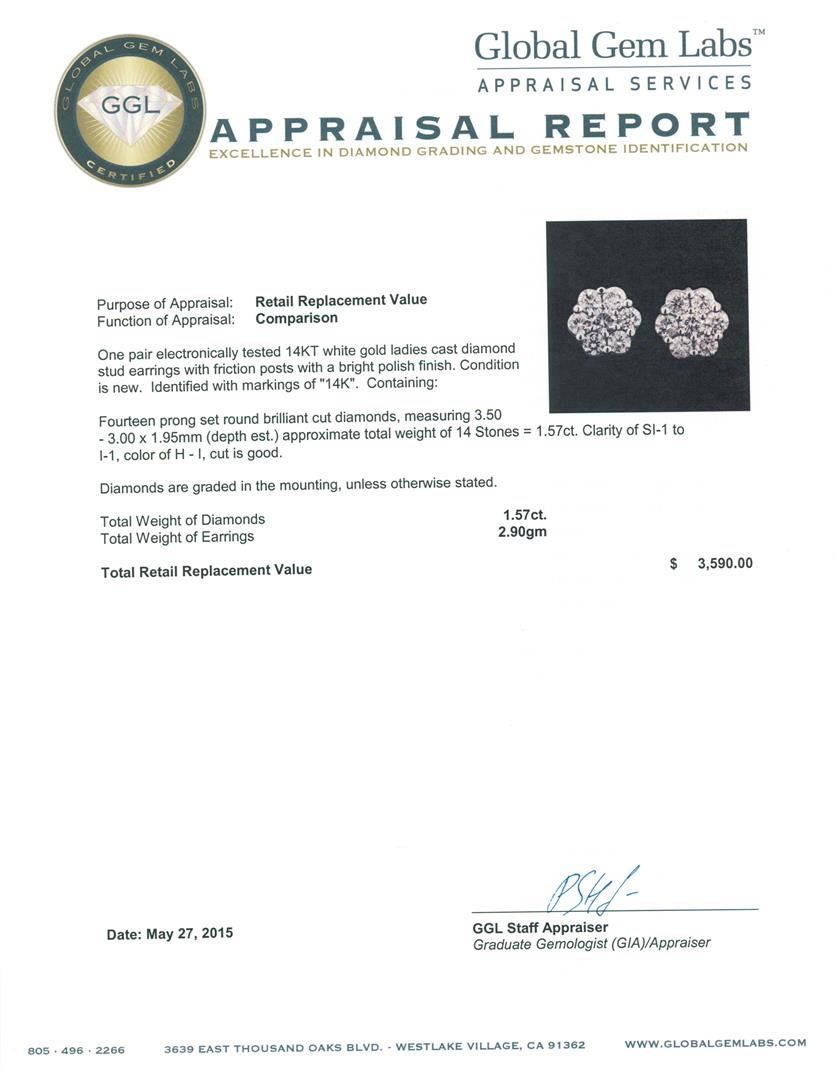 One pair electronically tested 14KT white gold ladies cast diamond stud earrings with friction posts with a bright polish finish. Identified with markings of "14K". Condition is new. Containing: Fourteen prong set round brilliant cut diamonds, measuring 3.50 - 3.00 x 1.95mm (depth est.) approximate total weight of 14 Stones = 1.57ct. Clarity: SI-1 to I-1. Color: H - I, Cut is Good. Diamonds are graded in the mounting, unless otherwise stated. Total Weight of Diamonds 1.57ct. Total Weight of Earrings 2.90 grams. GGL Appraised at $3,590.00.