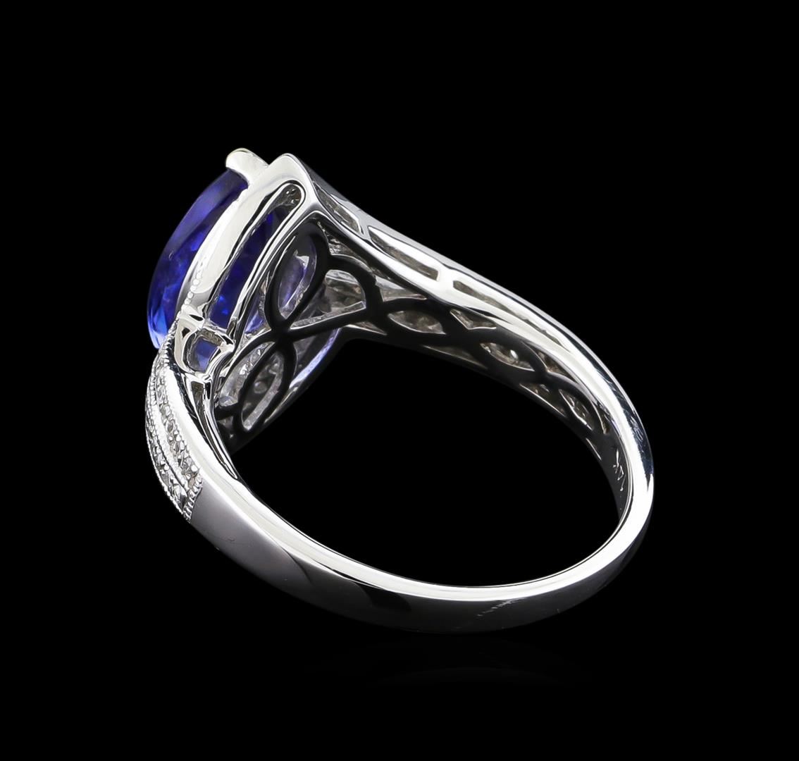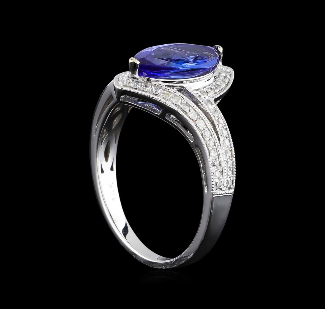 One electronically tested 14KT white gold ladies cast tanzanite and diamond ring. The featured tanzanite is set within mirroring diamond ribbons, completed by a two millimeter wide band. Bright polish finish with milgrain detailing throughout. Trademark is Orianne. Identified with markings of "14K". Condition is new, good workmanship. Containing: One prong set marquise brilliant cut natural tanzanite, measuring 11.40 x 6.00 x 3.40mm, 6% bulge factor, approximate weight of 1.57ct., clarity is eye clean, type I, medium dark, very slightly grayish, bluish violet color, (GIA bV 6/3), cut is good. Transmitting light with no distortion, transparent. Graded in the setting. Tanzanite is a very rare gemstone that is only found in the country of Tanzania. Originally discovered in 1967. Tiffany & Company, named the stone Tanzanite. It is found in the Usumburu Mountains that border the Umba Valley of northern Tanzania. Tanzanite occurs in gray, brown, violet, blue, reddish-purple, & green. The gem is interesting because of its exceptional pleochroism. Rotated in different directions a tanzanite will exhibit multiple changes of color. Tanzanite has a low tolerance to ultrasonic cleaning, and should not be cleaned using this method. Sixty prong set round brilliant cut diamonds, measuring 1.00 - 0.90 x 0.57mm (depth est.) approximate total weight of 60 Stones = 0.28ct. Graded in the setting. Clarity: I-2 to I-3. Color: G - I. Total Weight of Colored Stones 1.57ct. Total Weight of Diamonds 0.28ct. Total Weight of Ring 3.74 grams. AIG Appraised at $4,535.00.