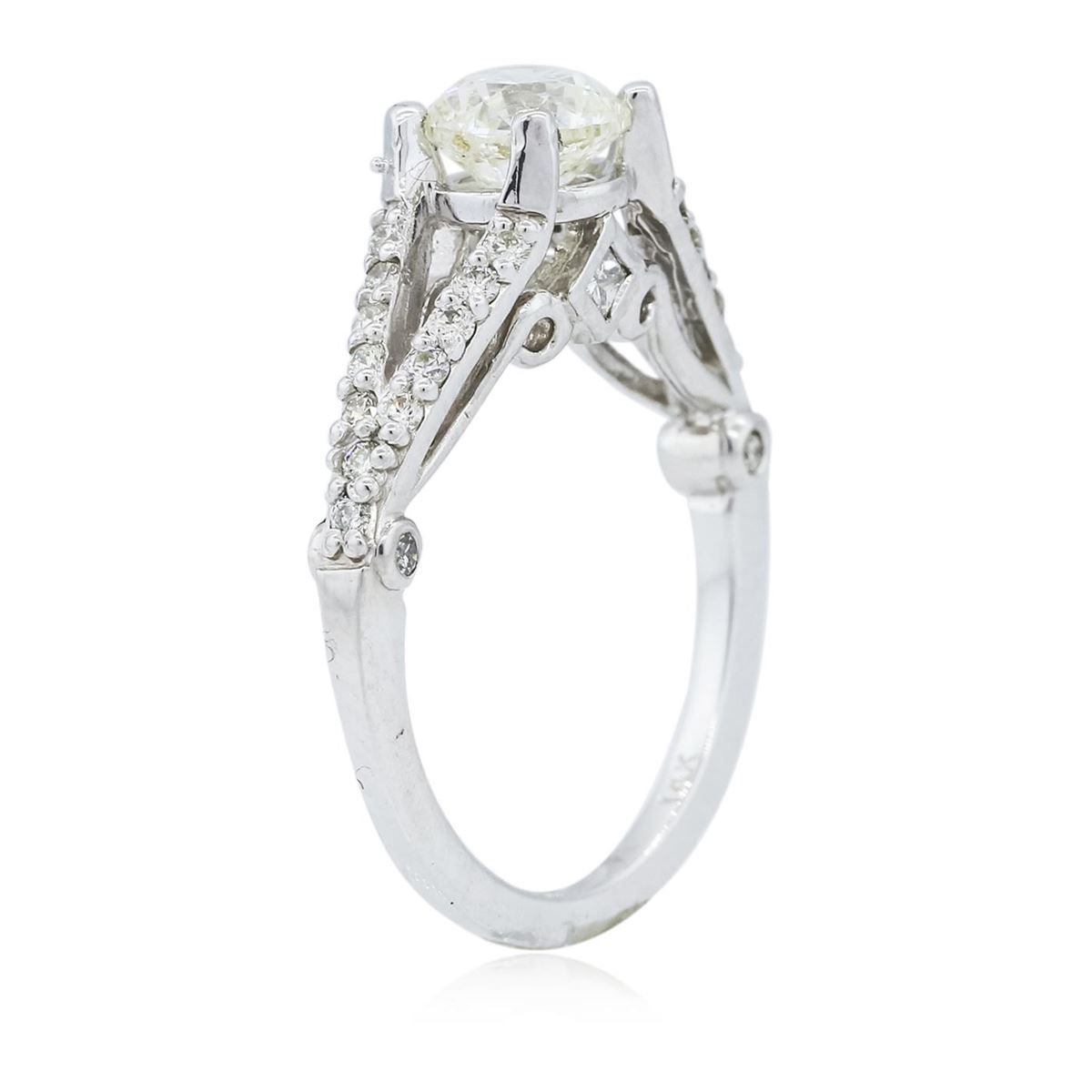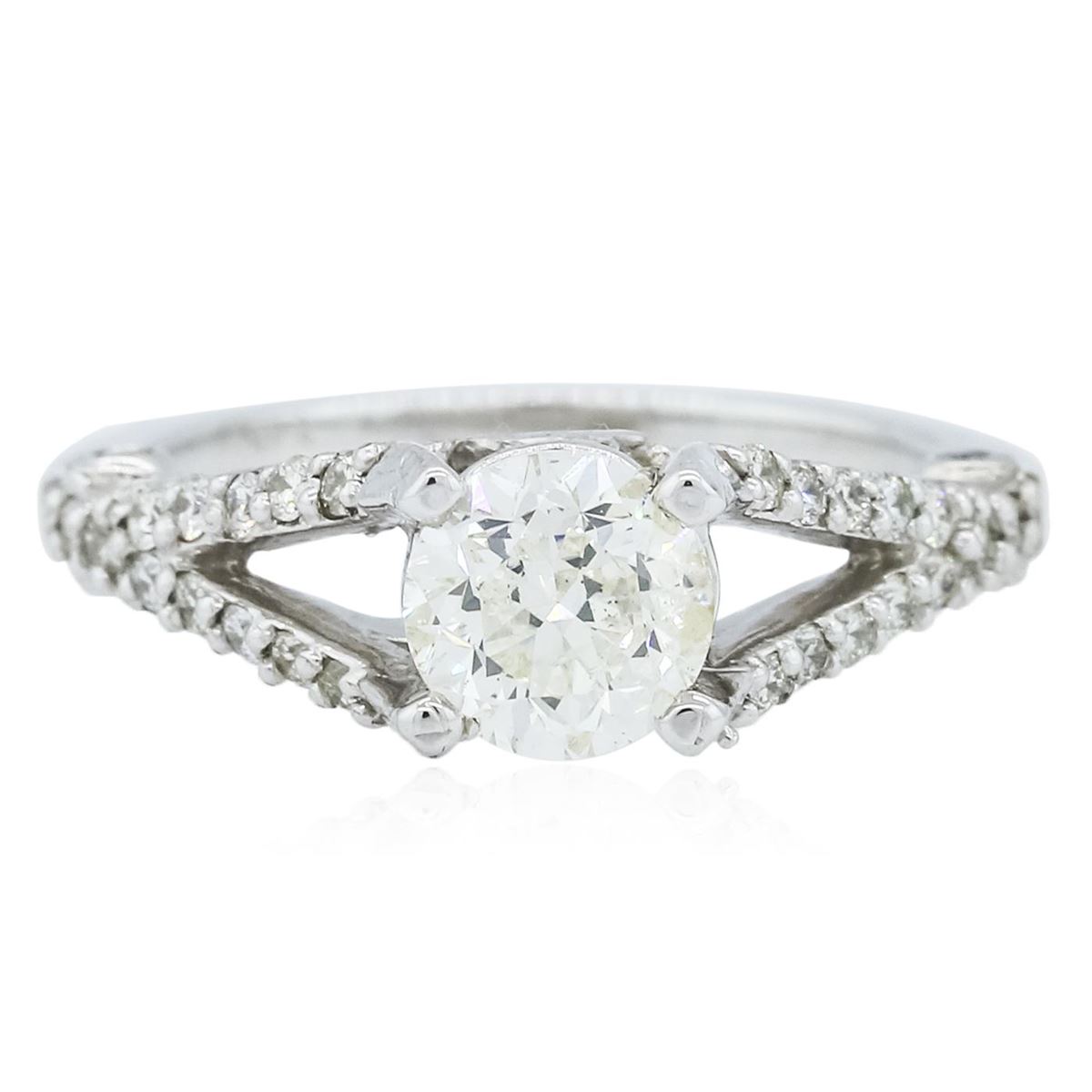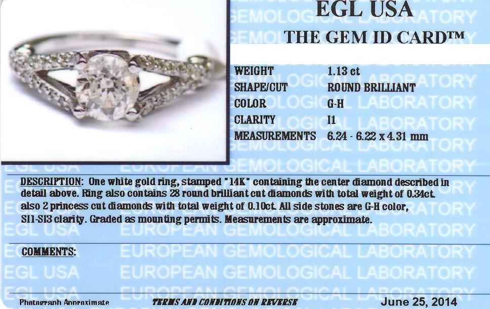 One electronically tested 14KT white gold Ladies combination cast & assembled engagement ring with a bright polish finish. Condition is new. Identified with markings of "14K". Containing: One prong set round brilliant cut diamond, measuring 6.24 - 6.22 x 4.31mm (depth est.) approximate. Total Weight of 1.13ct. Clarity: I-1. Color: G, Cut is Good. Twenty-Eight prong set round brilliant cut diamonds, measuring 1.50 - 1.50 x 0.90mm (depth est.) approximate. Total Weight of 28 Stones = 0.34ct. Clarity: SI-1 to SI-3. Color: G - H, Cut is Good. Two prong set princess cut diamonds, measuring 2.00 x 2.00 x 1.50mm (depth est.) approximate. Total Weight of 2 Stones = 0.10ct. Clarity: SI-1 to SI-3. Color: G - H, Cut is Good. EGL USA GEM ID# US 911348438D. All diamonds are graded in the mounting, unless otherwise stated. Total Weight of Diamonds 1.57ct. Total Weight of Engagement Ring 3.70 grams. GGL Appraised at $21,215.00.