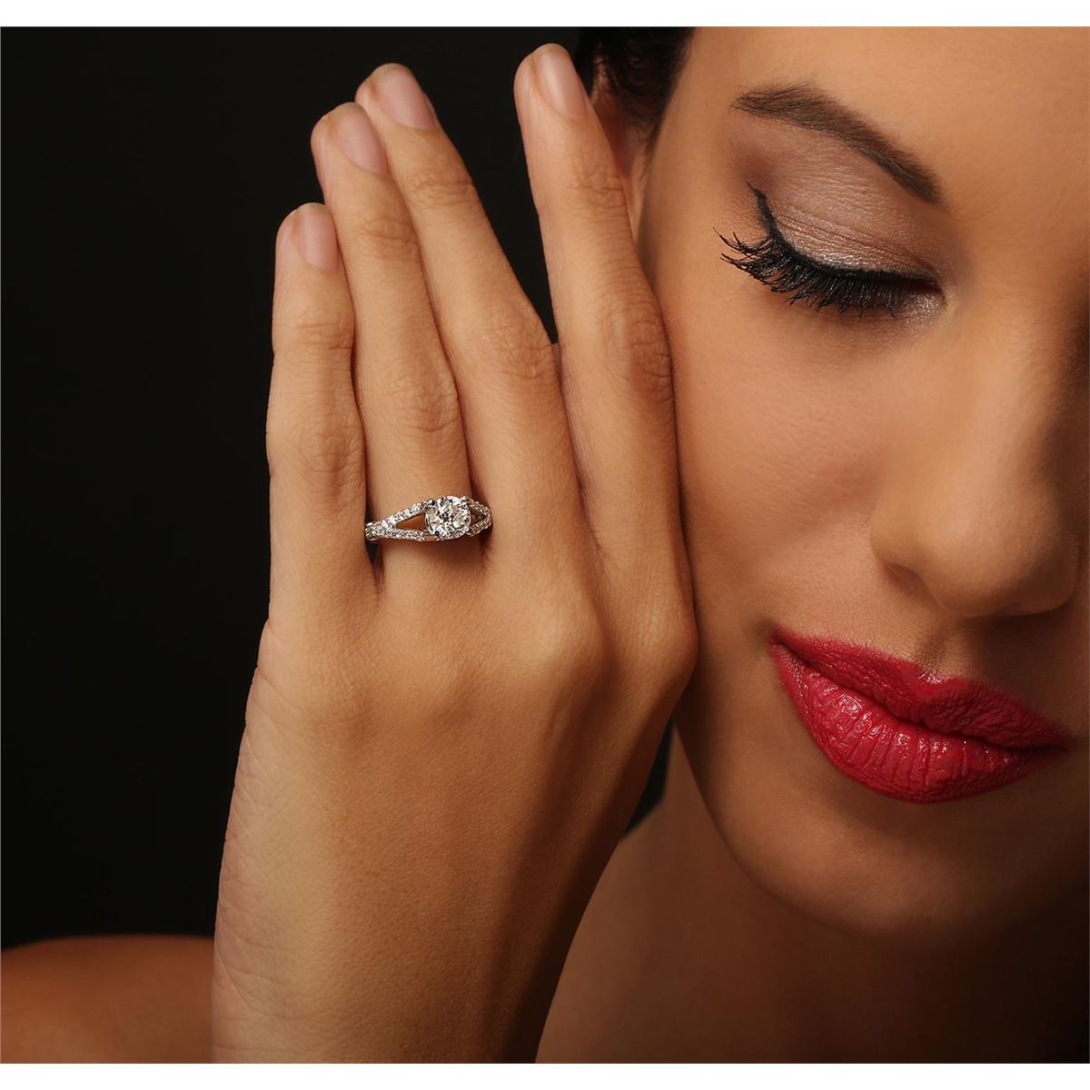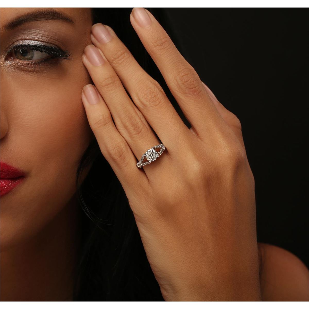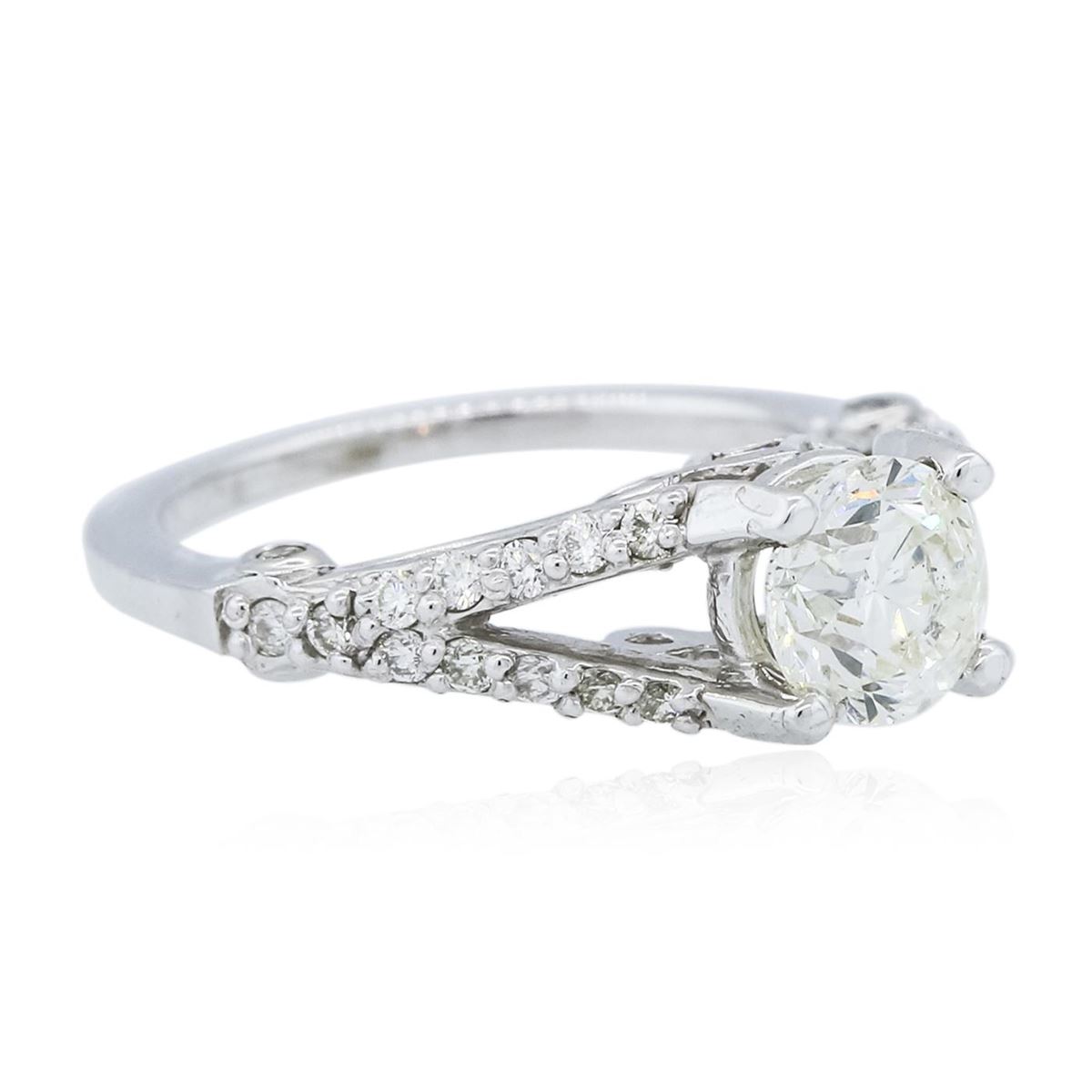 One electronically tested 14KT white gold Ladies combination cast & assembled engagement ring with a bright polish finish. Condition is new. Identified with markings of "14K". Containing: One prong set round brilliant cut diamond, measuring 6.24 - 6.22 x 4.31mm (depth est.) approximate. Total Weight of 1.13ct. Clarity: I-1. Color: G, Cut is Good. Twenty-Eight prong set round brilliant cut diamonds, measuring 1.50 - 1.50 x 0.90mm (depth est.) approximate. Total Weight of 28 Stones = 0.34ct. Clarity: SI-1 to SI-3. Color: G - H, Cut is Good. Two prong set princess cut diamonds, measuring 2.00 x 2.00 x 1.50mm (depth est.) approximate. Total Weight of 2 Stones = 0.10ct. Clarity: SI-1 to SI-3. Color: G - H, Cut is Good. EGL USA GEM ID# US 911348438D. All diamonds are graded in the mounting, unless otherwise stated. Total Weight of Diamonds 1.57ct. Total Weight of Engagement Ring 3.70 grams. GGL Appraised at $21,215.00.