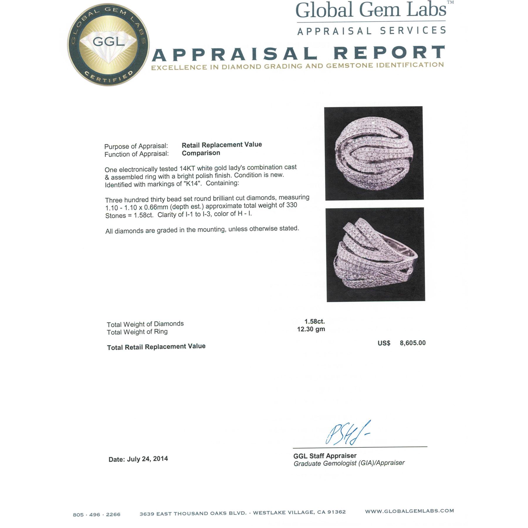 One electronically tested 14KT white gold ladies combination cast & assembled ring with a bright polish finish. Condition is new. Identified with markings of "K14". Containing: Three Hundred Thirty bead set round brilliant cut diamonds, measuring 1.10 - 1.10 x 0.66mm (depth est.) approximate total weight of 330 Stones = 1.58ct. Clarity: I-1 to I-3. Color: H - I. All diamonds are graded in the mounting, unless otherwise stated. Total Weight of Diamonds 1.58ct. Total Weight of Ring 12.30 grams. GGL Appraised at $8,605.00.