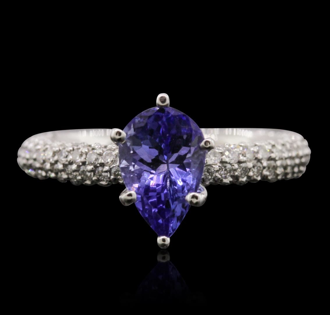 One electronically tested 14KT white gold ladies cast tanzanite and diamond ring with a bright polish finish. The featured tanzanite is supported by diamond set shoulders, completed by a three millimeter wide band. Identified with markings of "14K". Condition is new, good workmanship. Containing: One prong set pear brilliant cut natural tanzanite, measuring 9.00 x 5.80 x 4.00mm, 6%. bulge factor, approximate weight of 1.58ct., clarity is eye clean, type I, medium dark, moderately strong, bluish violet color, (GIA bV 6/4), cut is good. Transmitting light with no distortion, transparent. Graded in the setting. Tanzanite is a very rare gemstone that is only found in the country of Tanzania. Originally discovered in 1967. Tiffany & Company, named the stone Tanzanite. It is found in the Usumburu Mountains that border the Umba Valley of northern Tanzania. Tanzanite occurs in gray, brown, violet, blue, reddish-purple, & green. The gem is interesting because of its exceptional pleochroism. Rotated in different directions a tanzanite will exhibit multiple changes of color. Tanzanite has a low tolerance to ultrasonic cleaning, and should not be cleaned using this method. One Hundred Twenty-Eight pave set round brilliant cut diamonds, measuring 1.30 - 1.20 x 0.75mm (depth est.) approximate total weight of 128 Stones = 0.96ct. Graded in the setting. Clarity: SI-1 to I-1. Color: G - I. Total Weight of Colored Stones 1.58ct. Total Weight of Diamonds 0.96ct. Total Weight of Ring 3.56 grams. AIG Appraised at $7,155.00.