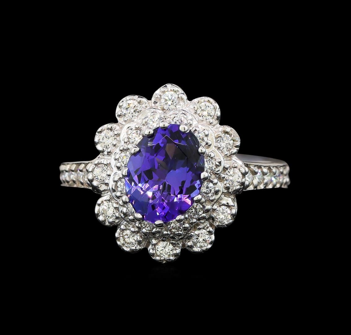 One electronically tested 14KT white gold ladies cast tanzanite and diamond ring with a flat shank with a bright polish finish. Identified with markings of "14K". Condition is new. Containing: One prong set oval modified brilliant cut natural tanzanite, measuring 8.50 x 6.02 x 4.41mm, approximate weight of 1.59ct., clarity is eye clean, type I, medium, moderately strong, violetish blue color, (GIA vB 5/4), cut is good. Thirty-Eight prong set round brilliant cut diamonds, measuring 1.50 - 1.50 x 0.90mm (depth est.) approximate total weight of 38 Stones = 0.47ct. Clarity: SI-1 to I-1. Color: I - J. All diamonds and colored gemstones are graded in the mounting, unless otherwise stated. Colored gemstones are presumed to have been subjected to commonly used enhancement processes. Total Weight of Colored Stones 1.59ct. Total Weight of Diamonds 0.47ct. Total Weight of Ring 4.90 grams. GGL Appraised at $4,025.00.