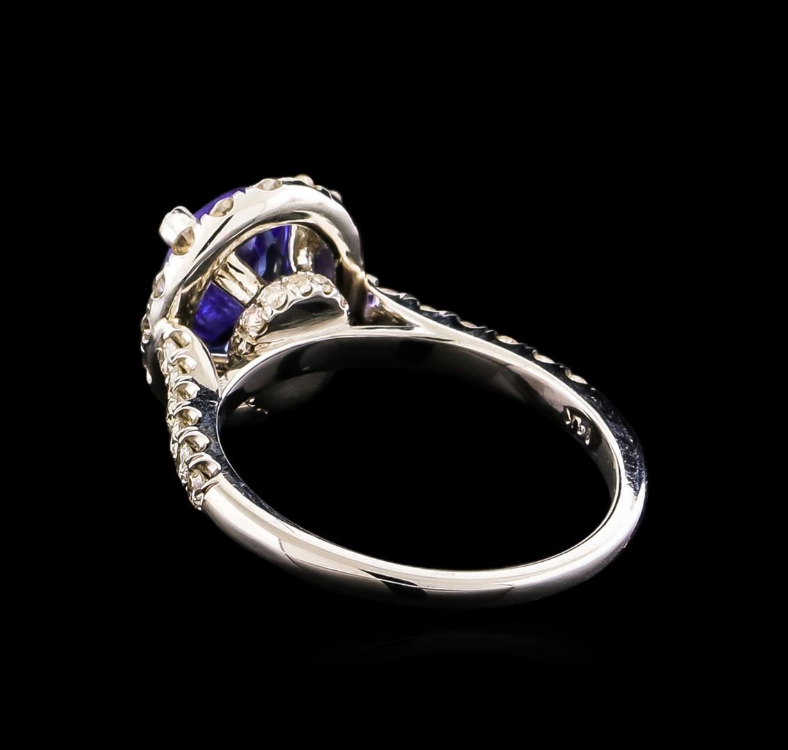 One electronically tested 14KT white gold ladies combination cast & assembled ring with a bright polish finish. Condition is new. Identified with markings of "14K". Containing: One prong set oval modified brilliant cut natural tanzanite, measuring 9.00 x 6.90 x 3.75mm, approximate weight of 1.59ct., clarity is eye clean, type I, medium light, very slightly grayish, violet color, (GIA V 4/3), cut is good. Twenty-Eight prong set round brilliant cut diamonds, measuring 1.70 - 1.70 x 1.02mm (depth est.) approximate total weight of 28 Stones = 0.50ct. Clarity: SI-2 to I-1. Color: I - J, Cut is Good. Colored gemstones are presumed to have been subjected to commonly used enhancement processes. All diamonds and colored gemstones are graded in the mounting, unless otherwise stated. Total Weight of Colored Stones 1.59ct. Total Weight of Diamonds 0.50ct. Total Weight of Ring 4.60 grams. GGL Appraised at $4,975.00.