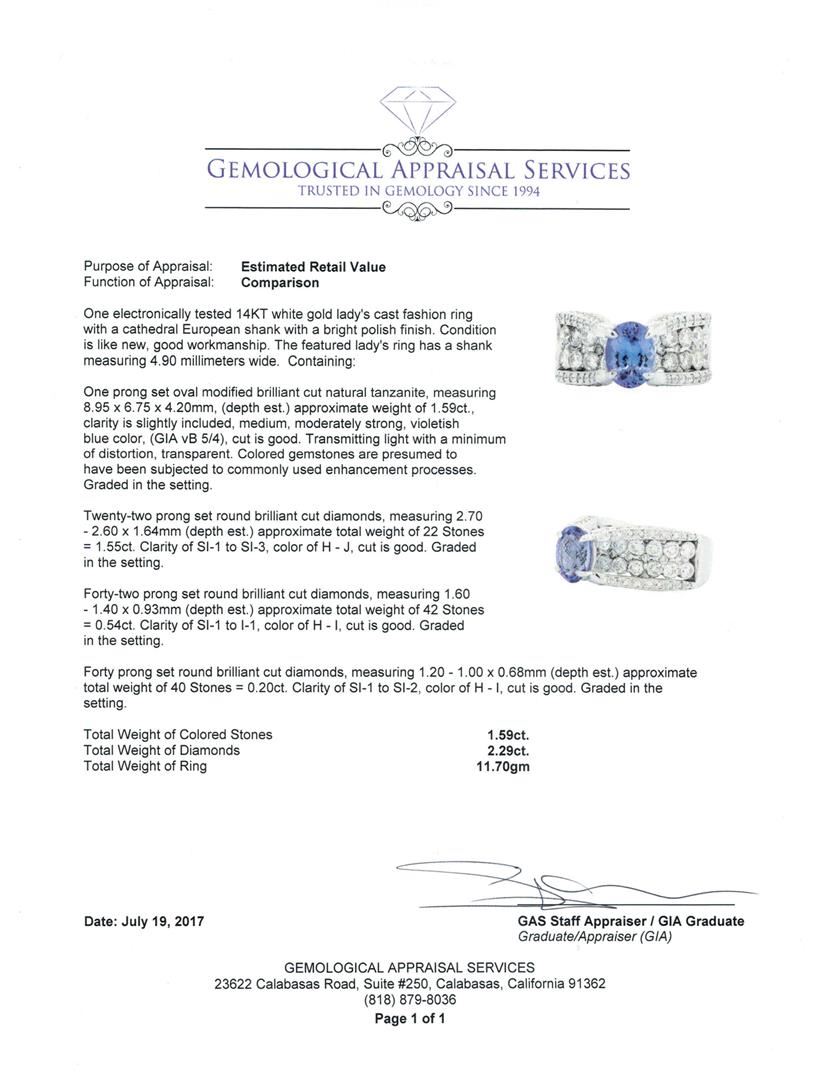 One electronically tested 14KT white gold Ladies cast fashion ring with a cathedral European shank with a bright polish finish. The featured Ladies ring has a shank measuring 4.90 millimeters wide. Condition is like new, good workmanship. Containing: One prong set oval modified brilliant cut natural tanzanite, measuring 8.95 x 6.75 x 4.20mm, (depth est.) approximate weight of 1.59ct., clarity is slightly included, medium, moderately strong, violetish blue color, (GIA vB 5/4), cut is good. Transmitting light with a minimum of distortion, transparent. Colored gemstones are presumed to have been subjected to commonly used enhancement processes. Graded in the setting. Twenty-Two prong set round brilliant cut diamonds, measuring 2.70 - 2.60 x 1.64mm (depth est.) approximate total weight of 22 Stones = 1.55ct. Graded in the setting. Color H - J Clarity SI-1 to SI-3 Cut Good Forty-Two prong set round brilliant cut diamonds, measuring 1.60 - 1.40 x 0.93mm (depth est.) approximate total weight of 42 Stones = 0.54ct. Graded in the setting. Color H - I Clarity SI-1 to I-1 Cut Good Forty prong set round brilliant cut diamonds, measuring 1.20 - 1.00 x 0.68mm (depth est.) approximate total weight of 40 Stones = 0.20ct. Graded in the setting. Color H - I Clarity SI-1 to SI-2 Cut Good. Total Weight of Colored Stones 1.59ct. Total Weight of Diamonds 2.29ct. Total Weight of Ring 11.70gm. GAS Appraised.