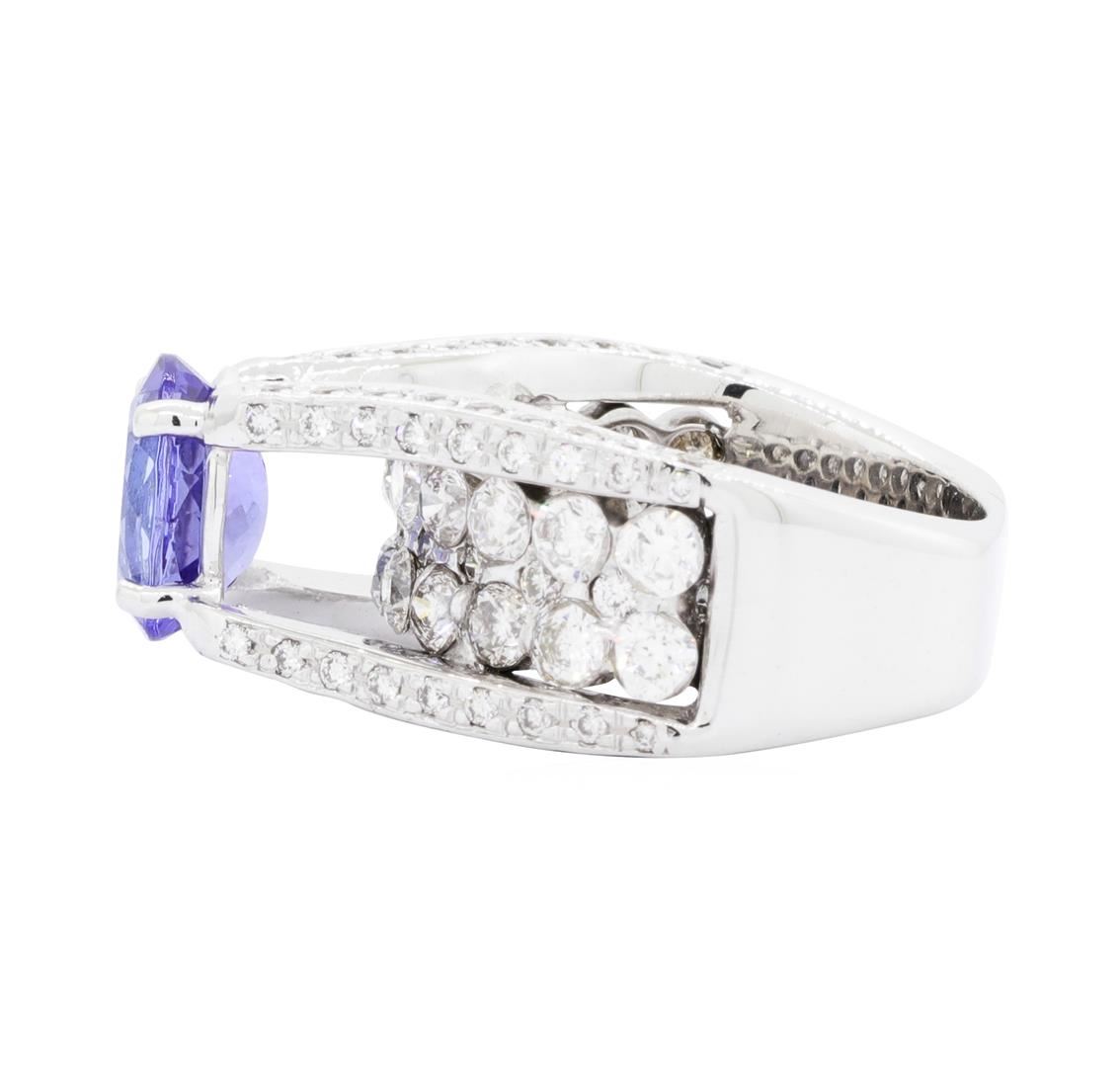 One electronically tested 14KT white gold Ladies cast fashion ring with a cathedral European shank with a bright polish finish. The featured Ladies ring has a shank measuring 4.90 millimeters wide. Condition is like new, good workmanship. Containing: One prong set oval modified brilliant cut natural tanzanite, measuring 8.95 x 6.75 x 4.20mm, (depth est.) approximate weight of 1.59ct., clarity is slightly included, medium, moderately strong, violetish blue color, (GIA vB 5/4), cut is good. Transmitting light with a minimum of distortion, transparent. Colored gemstones are presumed to have been subjected to commonly used enhancement processes. Graded in the setting. Twenty-Two prong set round brilliant cut diamonds, measuring 2.70 - 2.60 x 1.64mm (depth est.) approximate total weight of 22 Stones = 1.55ct. Graded in the setting. Color H - J Clarity SI-1 to SI-3 Cut Good Forty-Two prong set round brilliant cut diamonds, measuring 1.60 - 1.40 x 0.93mm (depth est.) approximate total weight of 42 Stones = 0.54ct. Graded in the setting. Color H - I Clarity SI-1 to I-1 Cut Good Forty prong set round brilliant cut diamonds, measuring 1.20 - 1.00 x 0.68mm (depth est.) approximate total weight of 40 Stones = 0.20ct. Graded in the setting. Color H - I Clarity SI-1 to SI-2 Cut Good. Total Weight of Colored Stones 1.59ct. Total Weight of Diamonds 2.29ct. Total Weight of Ring 11.70gm. GAS Appraised.