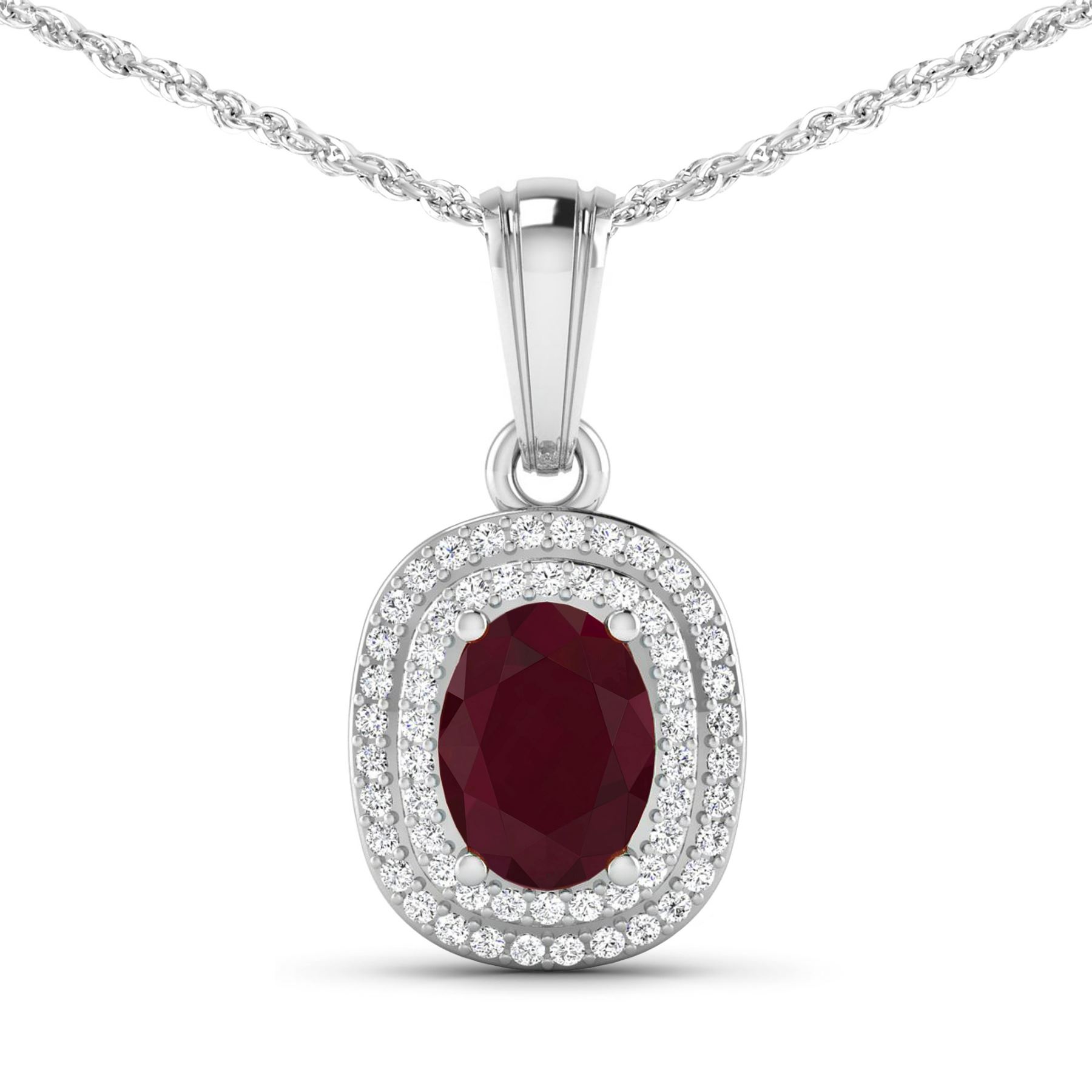 (1) Oval Ruby with a total weight of 1.50cts. (58) round Diamonds with a total weight of 0.26cts with a color of (i) and a clarity of i1-i2. Total weight of this pendant with chain is 2.97 grams. 16 inch chain.