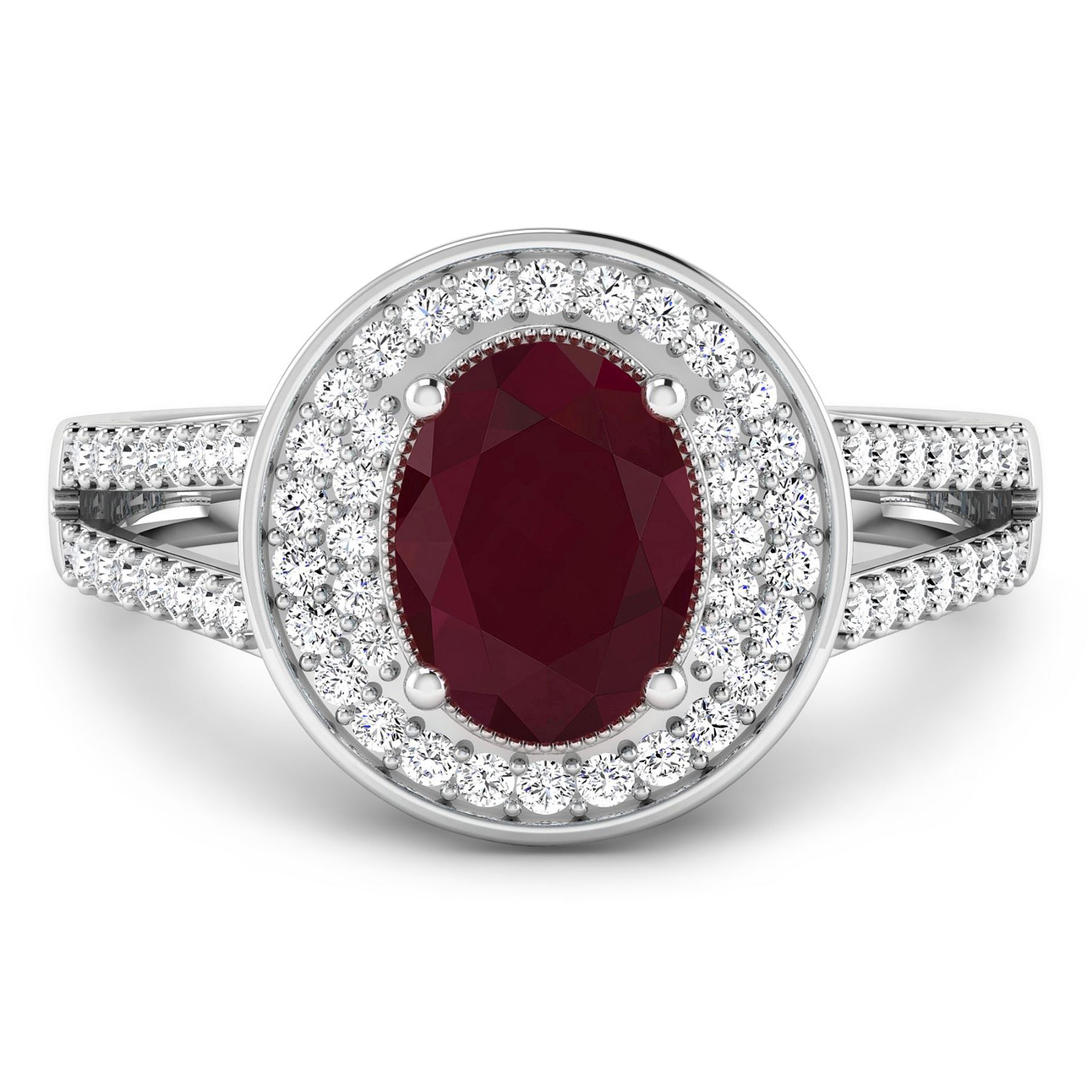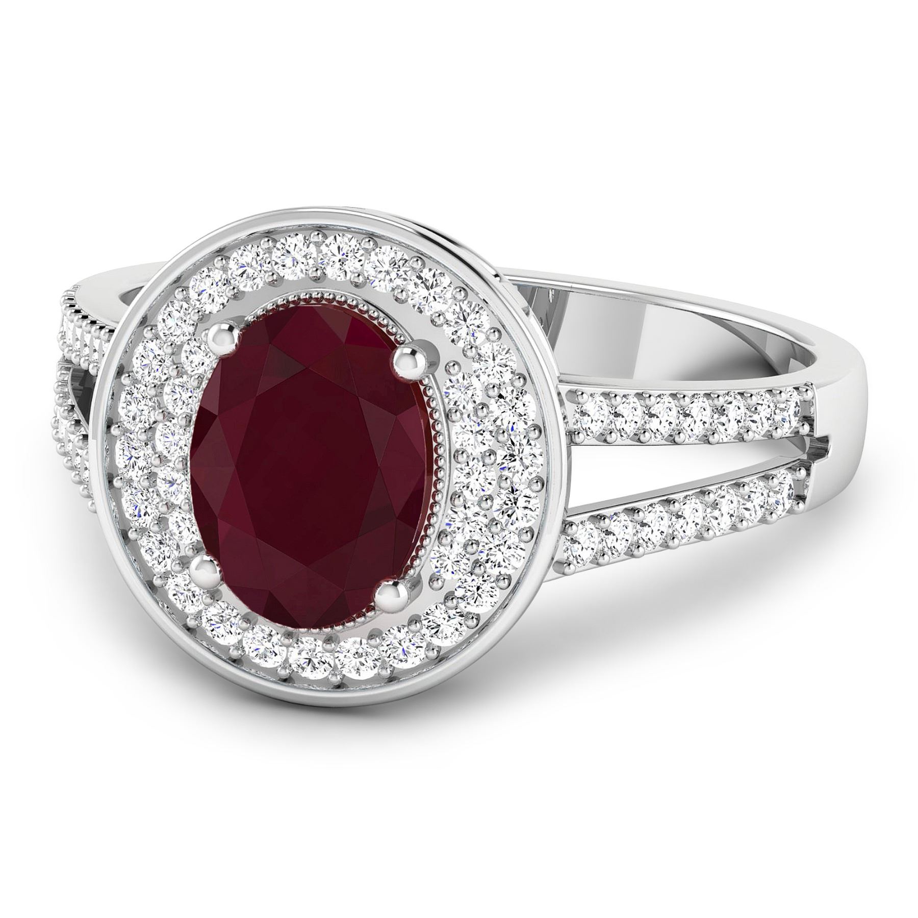 Ruby (AA) Oval 8x6mm - 1Pc + White Diamond F/C Round 1.10mm - 24Pcs + White Diamond F/C Round 1.00mm - 40Pcs ( I1-I2/I color ) Total weight of gemstone is 1.5cts. Total Diamond weight is 0.34cts. Total weight of this ring is 3.12 grams. Ring size 7.
