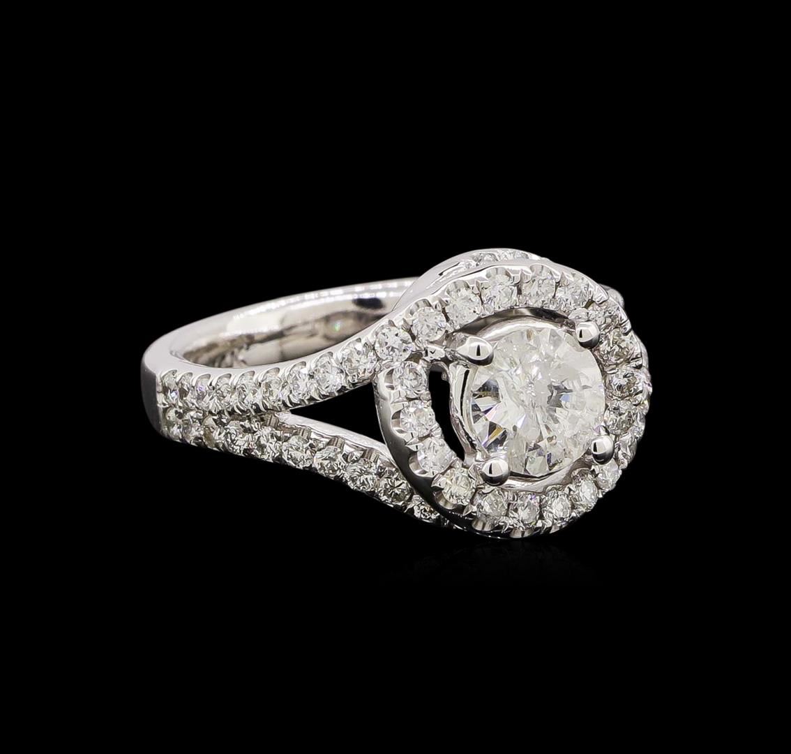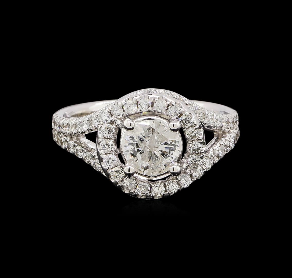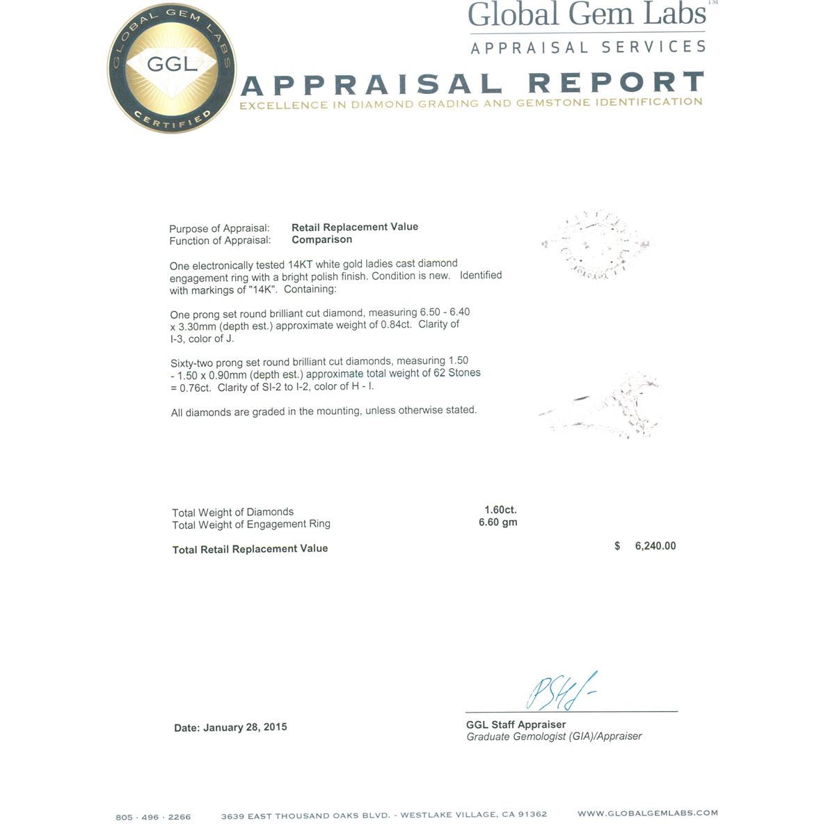 One electronically tested 14KT white gold ladies cast diamond engagement ring with a bright polish finish. Identified with markings of "14K". Condition is new. Containing: One prong set round brilliant cut diamond, measuring 6.50 - 6.40 x 3.30mm (depth est.) approximate weight of 0.84ct. Clarity: I-3. Color: J. Sixty-Two prong set round brilliant cut diamonds, measuring 1.50 - 1.50 x 0.90mm (depth est.) approximate total weight of 62 Stones = 0.76ct. Clarity: SI-2 to I-2. Color: H - I. All diamonds are graded in the mounting, unless otherwise stated. Total Weight of Diamonds 1.60ct. Total Weight of Engagement Ring 6.60 grams. GGL Appraised at $6,240.00.