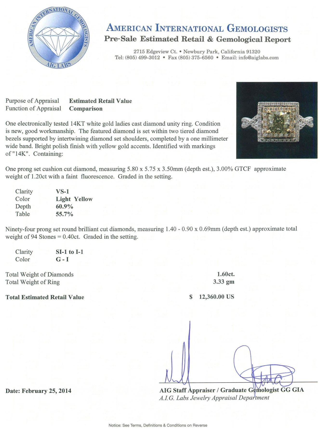 One electronically tested 14KT white gold ladies cast diamond unity ring. Condition is new, good workmanship. The featured diamond is set within two tiered diamond bezels supported by intertwining diamond set shoulders, completed by a one millimeter wide band. Bright polish finish with yellow gold accents. Identified with markings of "14K". Containing: One prong set cushion cut diamond, measuring 5.80 x 5.75 x 3.50mm (depth est.), 3.00% GTCF approximate weight of 1.20ct with a faint fluorescence. Graded in the setting. Clarity VS-1 Depth 60.9%Table 55.7% Ninety-Four prong set round brilliant cut diamonds, measuring 1.40 - 0.90 x 0.69mm (depth est.) approximate total weight of 94 Stones = 0.40ct. Graded in the setting. Clarity SI-1 to I-1 Color G - I Total Weight of Diamonds 1.60ct. Total Weight of Ring 3.33 grams. AIG Appraised.