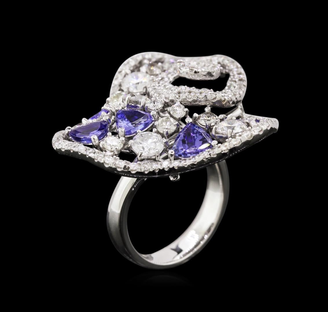 One electronically tested 14KT white gold ladies combination cast & assembled ring with a bright polish finish. Condition is new. Identified with markings of "585". Containing: Five prong set triangle modified brilliant cut natural tanzanites, measuring 4.50 x 4.50 x 2.61mm, approximate. Total Weight of 1.60ct., clarity is eye clean, type I, medium light, very slightly grayish, violet color, (GIA V 4/3), cut is good. One Hundred Thirty-One prong set round brilliant cut diamonds, measuring 1.30 - 1.30 x 0.78mm (depth est.) approximate. Total Weight of 131 Stones = 1.05ct. Clarity: I-1 to I-2. Color: I - J, Cut is Good. Eight prong set round brilliant cut diamonds, measuring 3.00 - 2.00 x 1.50mm (depth est.) approximate. Total Weight of 8 Stones = 0.46ct. Clarity: SI-1 to SI-2. Color: I - J, Cut is Good. Six prong set round brilliant cut diamonds, measuring 4.40 - 4.40 x 2.64mm (depth est.) approximate. Total Weight of 6 Stones = 1.87ct. Clarity: SI-1 to SI-2. Color: J, Cut is Good. Colored gemstones are presumed to have been subjected to commonly used enhancement processes. All diamonds and colored gemstones are graded in the mounting, unless otherwise stated. Total Weight of Colored Stones 1.60ct. Total Weight of Diamonds 3.38ct. Total Weight of Ring 12.70 grams. GGL Appraised at $19,490.00.