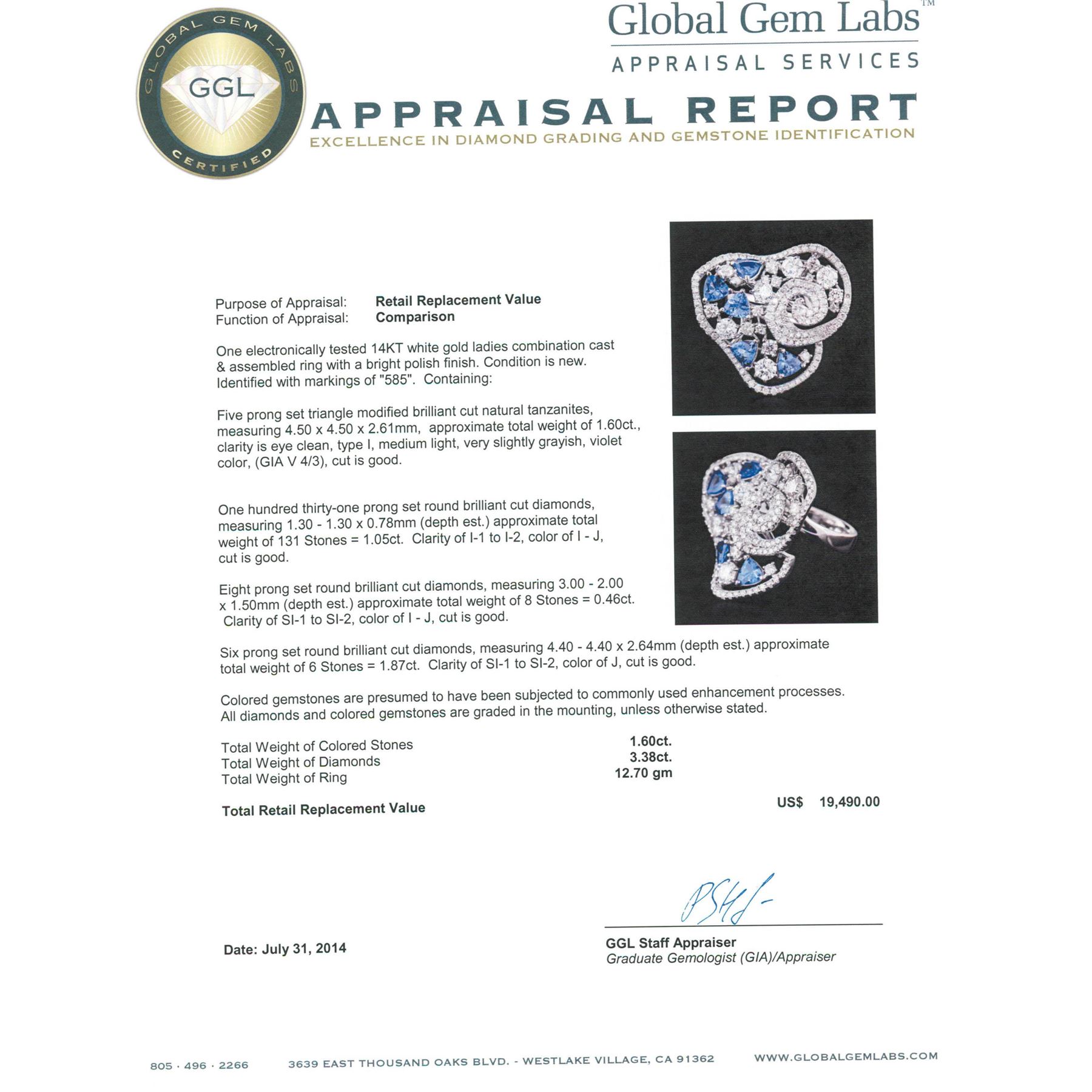 One electronically tested 14KT white gold ladies combination cast & assembled ring with a bright polish finish. Condition is new. Identified with markings of "585". Containing: Five prong set triangle modified brilliant cut natural tanzanites, measuring 4.50 x 4.50 x 2.61mm, approximate. Total Weight of 1.60ct., clarity is eye clean, type I, medium light, very slightly grayish, violet color, (GIA V 4/3), cut is good. One Hundred Thirty-One prong set round brilliant cut diamonds, measuring 1.30 - 1.30 x 0.78mm (depth est.) approximate. Total Weight of 131 Stones = 1.05ct. Clarity: I-1 to I-2. Color: I - J, Cut is Good. Eight prong set round brilliant cut diamonds, measuring 3.00 - 2.00 x 1.50mm (depth est.) approximate. Total Weight of 8 Stones = 0.46ct. Clarity: SI-1 to SI-2. Color: I - J, Cut is Good. Six prong set round brilliant cut diamonds, measuring 4.40 - 4.40 x 2.64mm (depth est.) approximate. Total Weight of 6 Stones = 1.87ct. Clarity: SI-1 to SI-2. Color: J, Cut is Good. Colored gemstones are presumed to have been subjected to commonly used enhancement processes. All diamonds and colored gemstones are graded in the mounting, unless otherwise stated. Total Weight of Colored Stones 1.60ct. Total Weight of Diamonds 3.38ct. Total Weight of Ring 12.70 grams. GGL Appraised at $19,490.00.