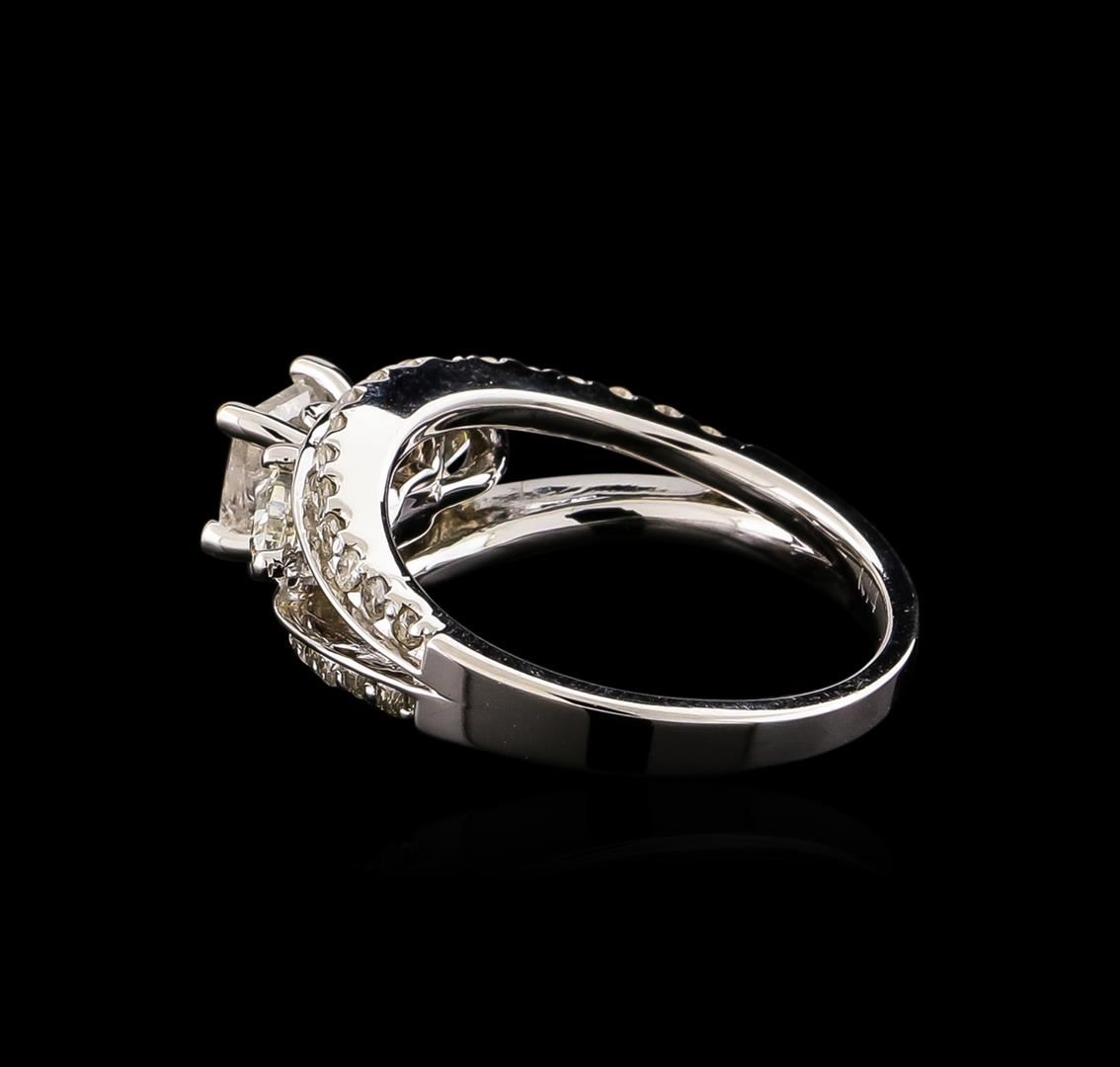 One electronically tested 14KT white gold ladies cast & assembled diamond unity ring with a bright polish finish. Condition is new, good workmanship. The featured diamond is set within a rose gold basket accented by a single diamond on either side and supported by mirroring diamond ribbons. The ring is completed by a two millimeter wide band. Identified with markings of "K14". Containing: One prong set princess cut diamond, measuring 4.70 x 4.65 x 3.50mm (depth est.) approximate weight of 0.72ct. Naturally occurring internal & external characteristics are present, including natural iridescence. Graded in the setting. Clarity: I-2. Color: 75.3%. Table 76.3%. Two prong set triangle brilliant cut diamonds, measuring 3.80 x 3.70 x 2.30mm (depth est.) approximate. Total Weight of 2 Stones = 0.40ct. Graded in the setting. Clarity: VS-1 to VS-2. Color: H - I Thirty-Four prong set round brilliant cut diamonds, measuring 1.50 - 1.40 x 0.87mm (depth est.) approximate. Total Weight of 34 Stones = 0.49ct. Graded in the setting. Clarity: I-1 to I-2. Color: H - J. Total Weight of Diamonds 1.61ct. Total Weight of Ring 5.05 grams. AIG Appraised at $7,955.00.