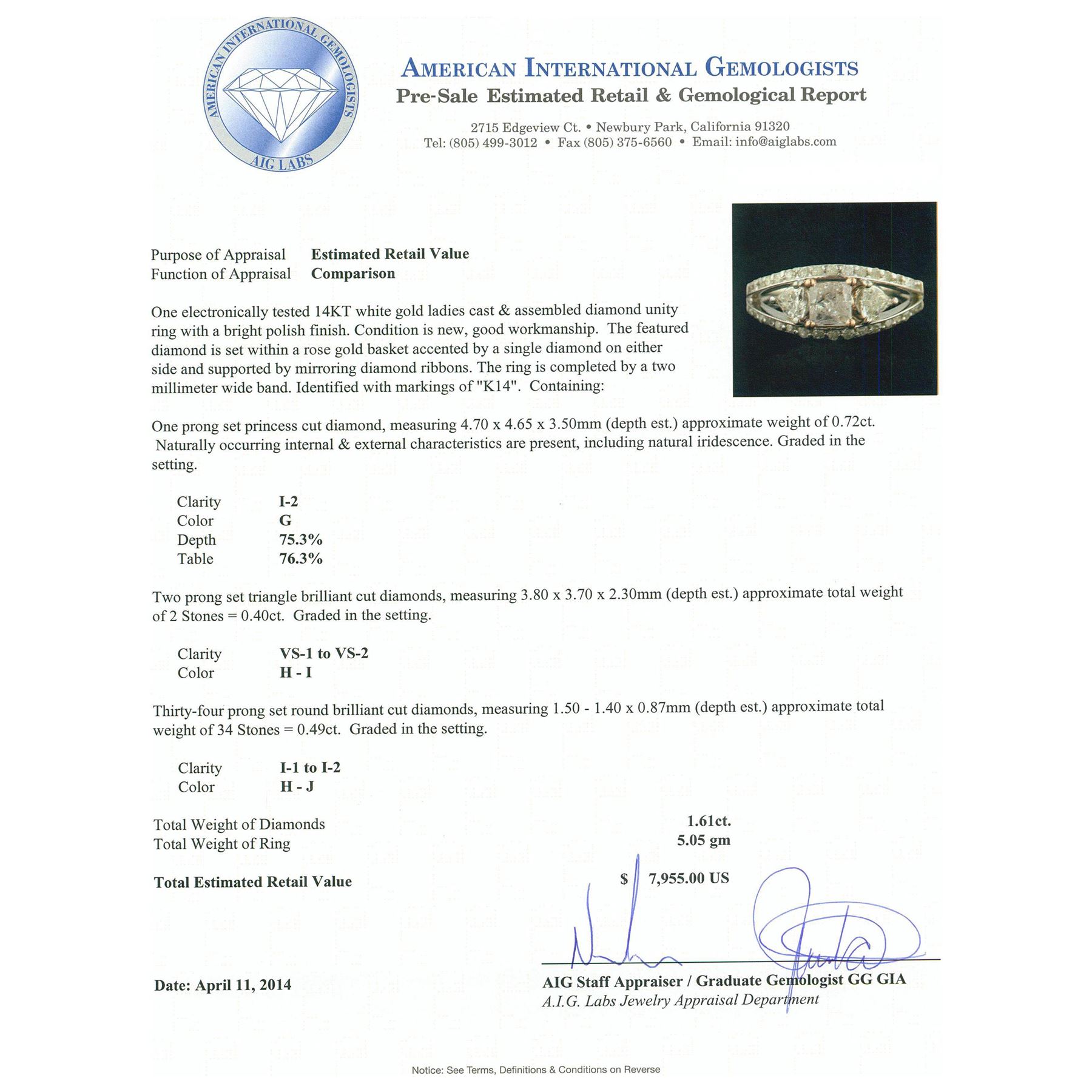 One electronically tested 14KT white gold ladies cast & assembled diamond unity ring with a bright polish finish. Condition is new, good workmanship. The featured diamond is set within a rose gold basket accented by a single diamond on either side and supported by mirroring diamond ribbons. The ring is completed by a two millimeter wide band. Identified with markings of "K14". Containing: One prong set princess cut diamond, measuring 4.70 x 4.65 x 3.50mm (depth est.) approximate weight of 0.72ct. Naturally occurring internal & external characteristics are present, including natural iridescence. Graded in the setting. Clarity: I-2. Color: 75.3%. Table 76.3%. Two prong set triangle brilliant cut diamonds, measuring 3.80 x 3.70 x 2.30mm (depth est.) approximate. Total Weight of 2 Stones = 0.40ct. Graded in the setting. Clarity: VS-1 to VS-2. Color: H - I Thirty-Four prong set round brilliant cut diamonds, measuring 1.50 - 1.40 x 0.87mm (depth est.) approximate. Total Weight of 34 Stones = 0.49ct. Graded in the setting. Clarity: I-1 to I-2. Color: H - J. Total Weight of Diamonds 1.61ct. Total Weight of Ring 5.05 grams. AIG Appraised at $7,955.00.