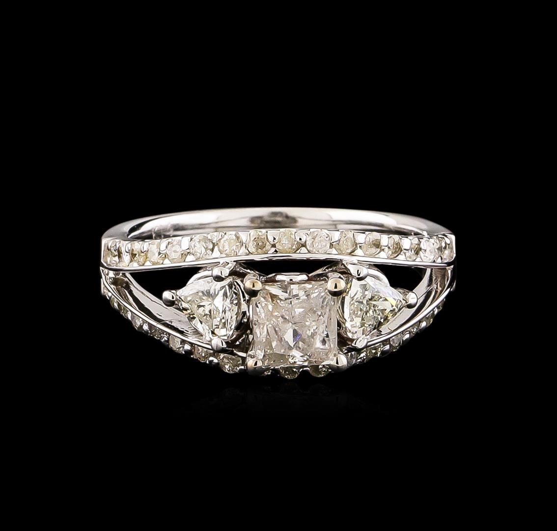 One electronically tested 14KT white gold ladies cast & assembled diamond unity ring with a bright polish finish. Condition is new, good workmanship. The featured diamond is set within a rose gold basket accented by a single diamond on either side and supported by mirroring diamond ribbons. The ring is completed by a two millimeter wide band. Identified with markings of "K14". Containing: One prong set princess cut diamond, measuring 4.70 x 4.65 x 3.50mm (depth est.) approximate weight of 0.72ct. Naturally occurring internal & external characteristics are present, including natural iridescence. Graded in the setting. Clarity: I-2. Color: 75.3%. Table 76.3%. Two prong set triangle brilliant cut diamonds, measuring 3.80 x 3.70 x 2.30mm (depth est.) approximate. Total Weight of 2 Stones = 0.40ct. Graded in the setting. Clarity: VS-1 to VS-2. Color: H - I Thirty-Four prong set round brilliant cut diamonds, measuring 1.50 - 1.40 x 0.87mm (depth est.) approximate. Total Weight of 34 Stones = 0.49ct. Graded in the setting. Clarity: I-1 to I-2. Color: H - J. Total Weight of Diamonds 1.61ct. Total Weight of Ring 5.05 grams. AIG Appraised at $7,955.00.