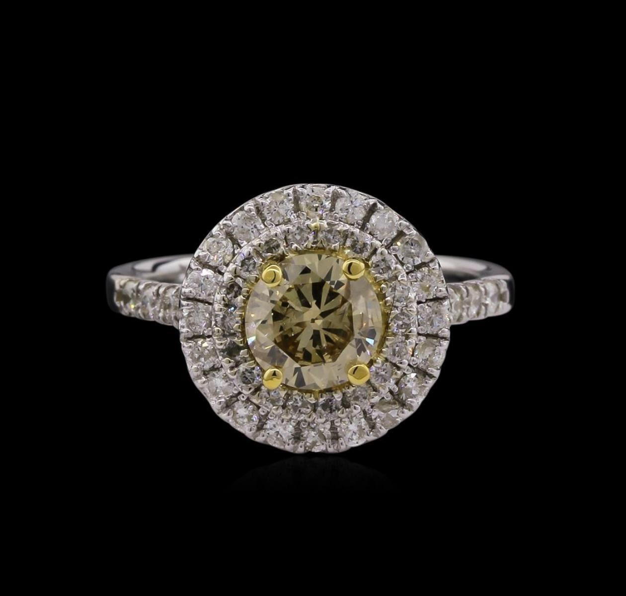One electronically tested 14KT white gold ladies cast & assembled diamond ring with a bright polish finish. Condition is good. The featured diamond is set within a yellow gold basket and placed within tiered diamond bezels. The ring is supported by split diamond set shoulders, completed by a one and one-half millimeter wide band. Identified with markings of "14K". Containing: One prong set round brilliant cut diamond, measuring 6.30 - 6.30 x 3.80mm (depth est.) approximate weight of 0.94ct. Faint brown secondary color throughout. Graded in the setting. Clarity I-1. Color Light Yellow. Depth 60.3%. Table 65.1%. Fifty-six prong set round brilliant cut diamonds, measuring 1.60 - 1.30 x 0.87mm (depth est.) approximate total weight of 56 Stones = 0.67ct. Graded in the setting. Clarity I-1 to 1-2. Color G -- I. Total Weight of Diamonds 1.61ct. Total Weight of Ring 4.11gm. AIG Appraised.
