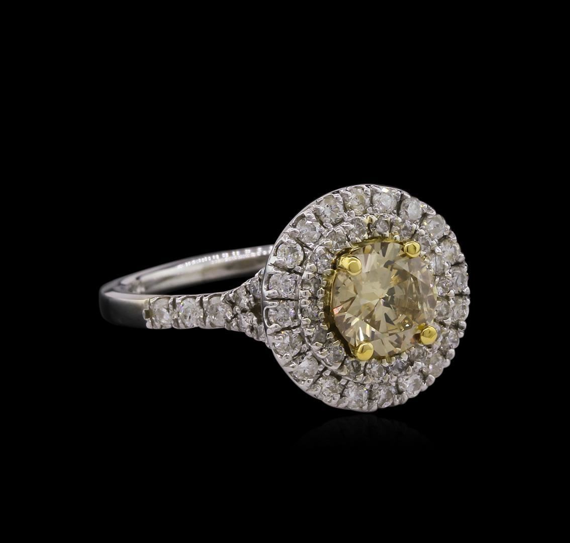One electronically tested 14KT white gold ladies cast & assembled diamond ring with a bright polish finish. Condition is good. The featured diamond is set within a yellow gold basket and placed within tiered diamond bezels. The ring is supported by split diamond set shoulders, completed by a one and one-half millimeter wide band. Identified with markings of "14K". Containing: One prong set round brilliant cut diamond, measuring 6.30 - 6.30 x 3.80mm (depth est.) approximate weight of 0.94ct. Faint brown secondary color throughout. Graded in the setting. Clarity I-1. Color Light Yellow. Depth 60.3%. Table 65.1%. Fifty-six prong set round brilliant cut diamonds, measuring 1.60 - 1.30 x 0.87mm (depth est.) approximate total weight of 56 Stones = 0.67ct. Graded in the setting. Clarity I-1 to 1-2. Color G -- I. Total Weight of Diamonds 1.61ct. Total Weight of Ring 4.11gm. AIG Appraised.