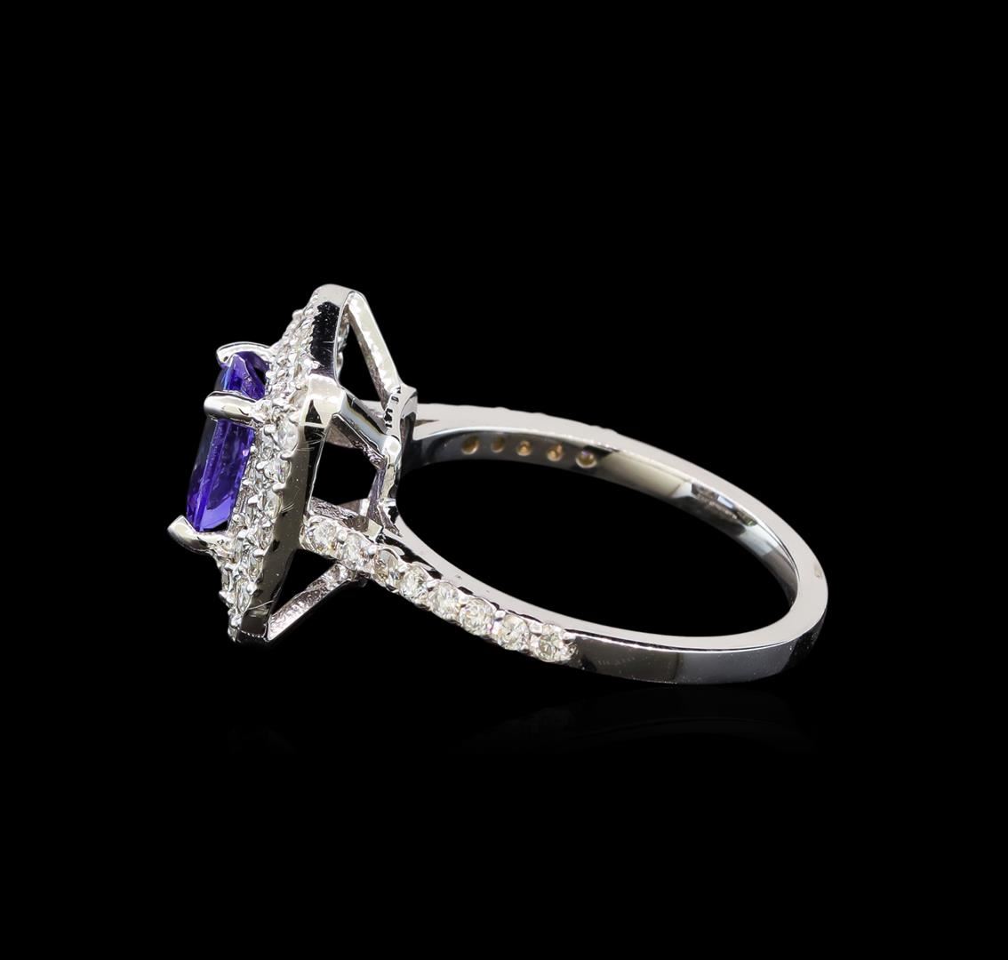 One electronically tested 14KT white gold ladies cast tanzanite and diamond ring with a bright polish finish. Identified with markings of "K14". Condition is new. Containing: One prong set square cushion modified brilliant cut natural tanzanite, measuring 6.80 x 6.80 x 4.42mm, approximate weight of 1.61ct., clarity is eye clean, type I, medium light, very slightly grayish, violet color, (GIA V 4/3), cut is good. Fifty prong set round brilliant cut diamonds, measuring 1.30 - 1.30 x 0.78mm (depth est.) approximate total weight of 50 Stones = 0.40ct. Clarity: SI-1 to I-1. Color: H - I, Cut is Good. Colored gemstones are presumed to have been subjected to commonly used enhancement processes. All diamonds and colored gemstones are graded in the mounting, unless otherwise stated. Total Weight of Colored Stones 1.61ct. Total Weight of Diamonds 0.40ct. Total Weight of Ring 3.60 grams. GGL Appraised at $3,270.00.