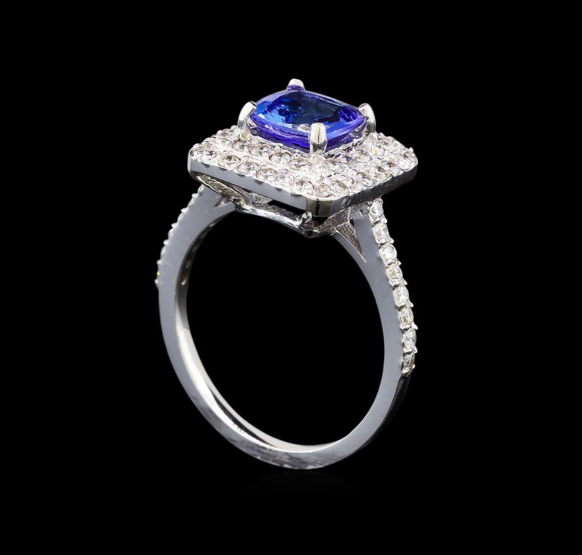 One electronically tested 14KT white gold ladies cast tanzanite and diamond ring with a bright polish finish. Identified with markings of "K14". Condition is new. Containing: One prong set square cushion modified brilliant cut natural tanzanite, measuring 6.80 x 6.80 x 4.42mm, approximate weight of 1.61ct., clarity is eye clean, type I, medium light, very slightly grayish, violet color, (GIA V 4/3), cut is good. Fifty prong set round brilliant cut diamonds, measuring 1.30 - 1.30 x 0.78mm (depth est.) approximate total weight of 50 Stones = 0.40ct. Clarity: SI-1 to I-1. Color: H - I, Cut is Good. Colored gemstones are presumed to have been subjected to commonly used enhancement processes. All diamonds and colored gemstones are graded in the mounting, unless otherwise stated. Total Weight of Colored Stones 1.61ct. Total Weight of Diamonds 0.40ct. Total Weight of Ring 3.60 grams. GGL Appraised at $3,270.00.