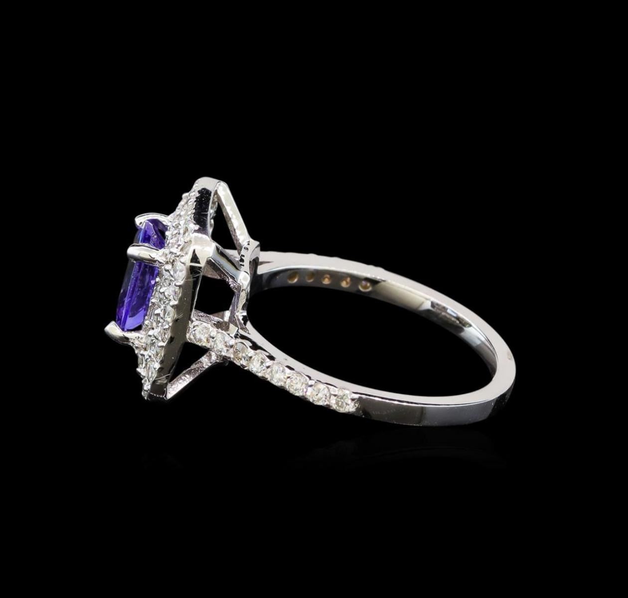 One electronically tested 14KT white gold ladies cast tanzanite and diamond ring with a bright polish finish. Identified with markings of "K14". Condition is new. Containing: One prong set square cushion modified brilliant cut natural tanzanite, measuring 6.80 x 6.80 x 4.42mm, approximate weight of 1.61ct., clarity is eye clean, type I, medium light, very slightly grayish, violet color, (GIA V 4/3), cut is good. Fifty prong set round brilliant cut diamonds, measuring 1.30 - 1.30 x 0.78mm (depth est.) approximate total weight of 50 Stones = 0.40ct. Clarity: SI-1 to I-1. Color: H - I, Cut is Good. Colored gemstones are presumed to have been subjected to commonly used enhancement processes. All diamonds and colored gemstones are graded in the mounting, unless otherwise stated. Total Weight of Colored Stones 1.61ct. Total Weight of Diamonds 0.40ct. Total Weight of Ring 3.60 grams. GGL Appraised.