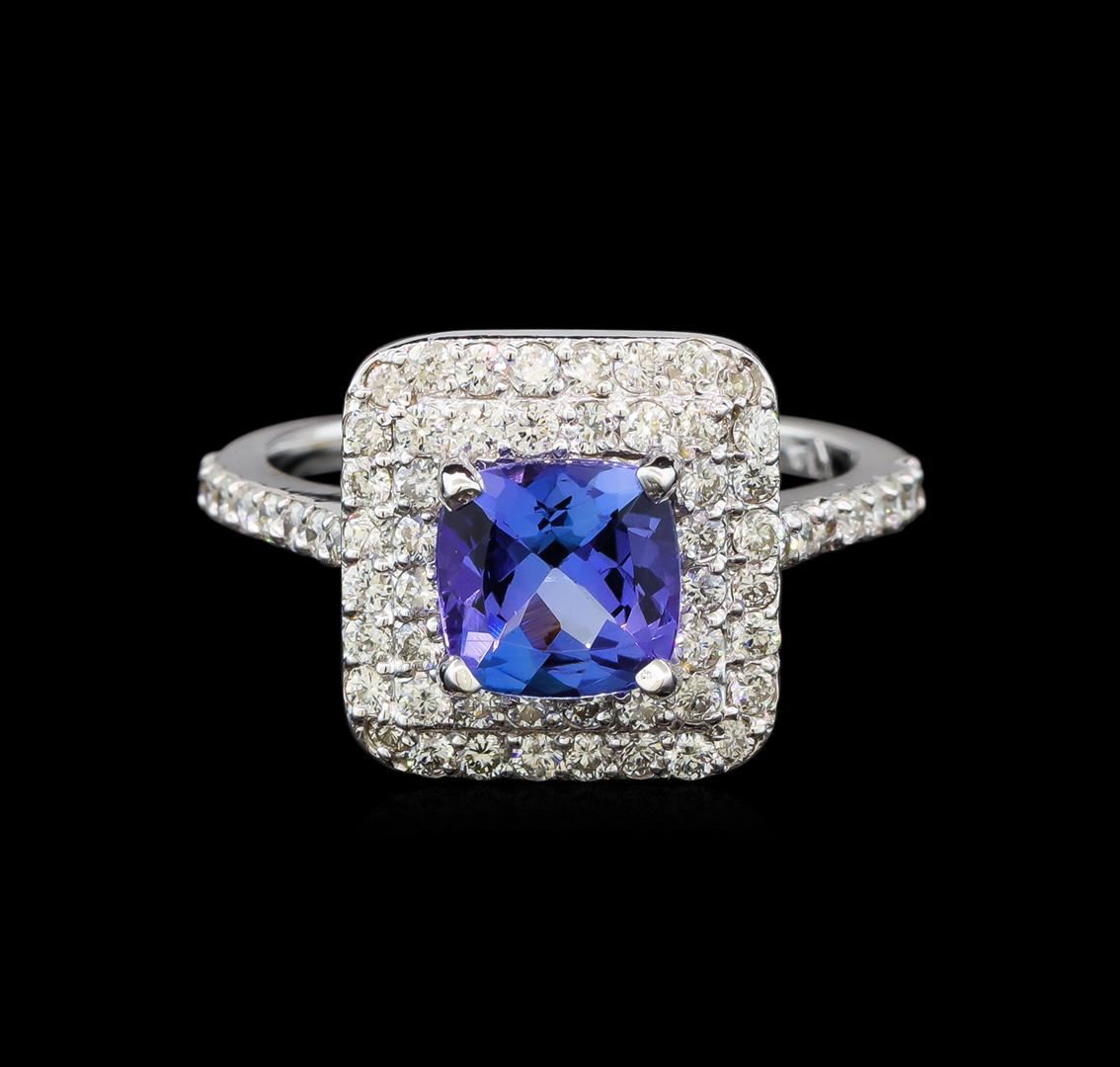 One electronically tested 14KT white gold ladies cast tanzanite and diamond ring with a bright polish finish. Identified with markings of "K14". Condition is new. Containing: One prong set square cushion modified brilliant cut natural tanzanite, measuring 6.80 x 6.80 x 4.42mm, approximate weight of 1.61ct., clarity is eye clean, type I, medium light, very slightly grayish, violet color, (GIA V 4/3), cut is good. Fifty prong set round brilliant cut diamonds, measuring 1.30 - 1.30 x 0.78mm (depth est.) approximate total weight of 50 Stones = 0.40 ct. Clarity: SI-1 to I-1. Color: H - I, Cut is Good. Colored gemstones are presumed to have been subjected to commonly used enhancement processes. All diamonds and colored gemstones are graded in the mounting, unless otherwise stated. Total Weight of Colored Stones 1.61ct. Total Weight of Diamonds 0.40 ct. Total Weight of Ring 3.60 grams. GGL Appraised.