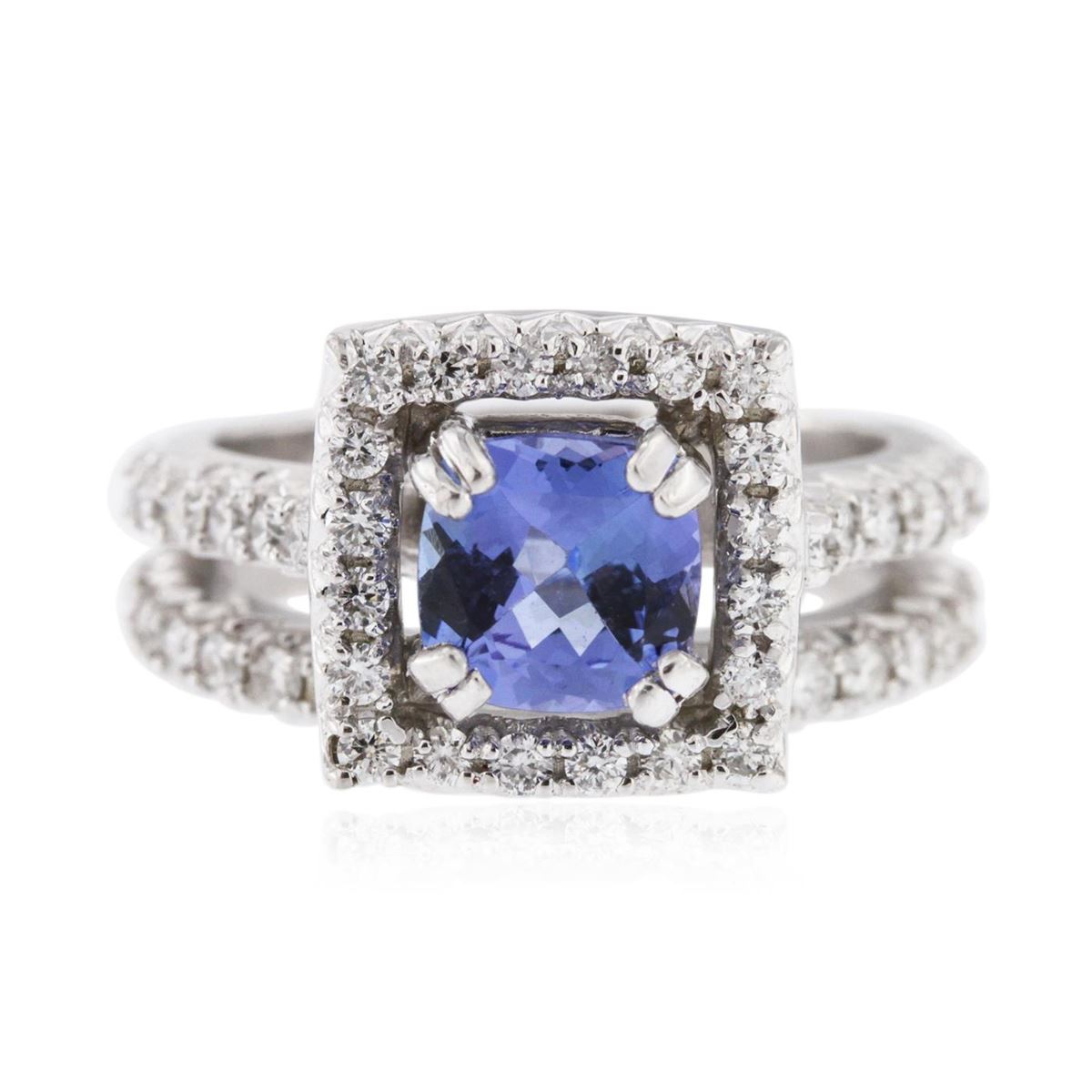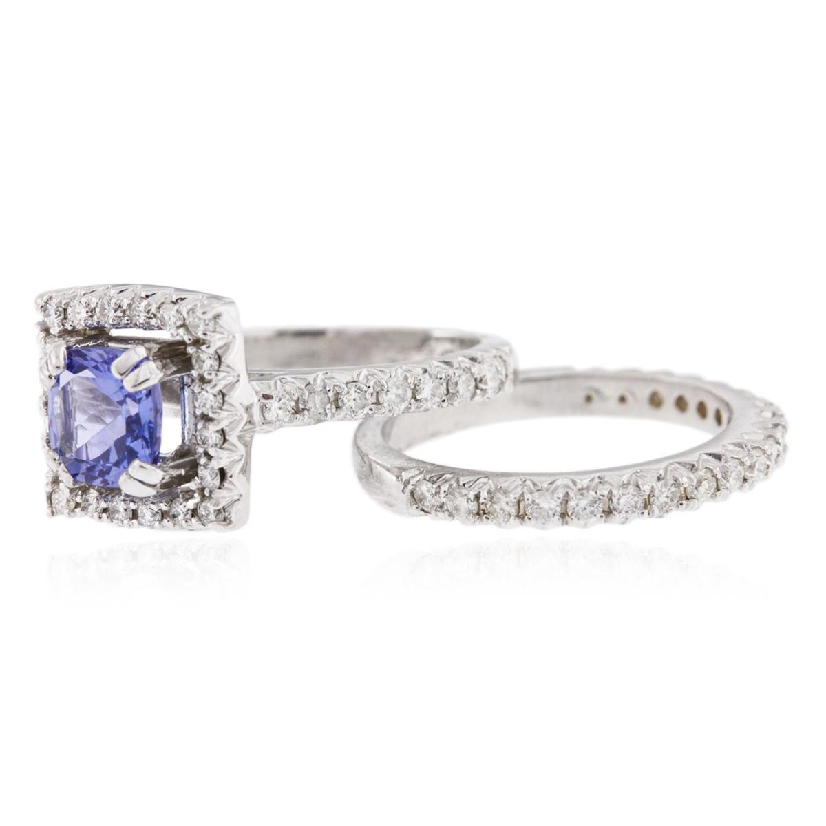 One electronically tested 14KT white gold ladies cast tanzanite and diamond engagement ring & wedding band with a bright polish finish. Identified with markings of "14K". Condition is new. Containing: One prong set square cushion modified brilliant cut natural tanzanite, measuring 6.80 x 6.80 x 4.42mm, approximate weight of 1.61ct., clarity is eye clean, type I, medium light, very slightly grayish, violet color, (GIA V 4/3), cut is good. Fifty-Six prong set round brilliant cut diamonds, measuring 1.50 - 1.50 x 0.90mm (depth est.) approximate total weight of 56 Stones = 0.69ct. Clarity: SI-2 to I-1. Color: I - J, Cut is Good. Colored gemstones are presumed to have been subjected to commonly used enhancement processes. All diamonds and colored gemstones are graded in the mounting, unless otherwise stated. Total Weight of Colored Stones 1.61ct. Total Weight of Diamonds 0.69ct. Total Weight of Engagement Ring & Wedding Band 8.10 grams. GGL Appraised at $5,170.00.