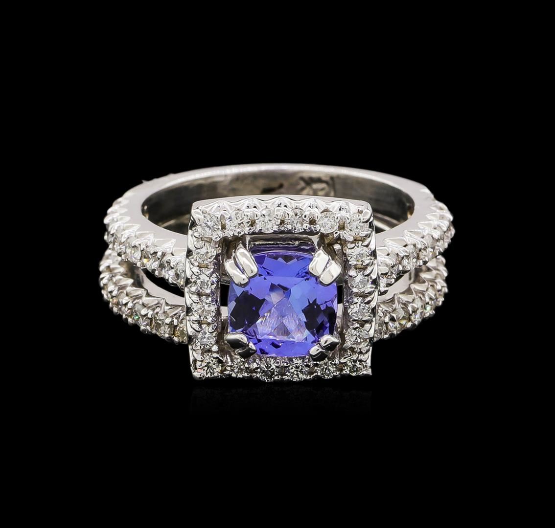 One electronically tested 14KT white gold ladies cast tanzanite and diamond engagement ring & wedding band with a bright polish finish. Identified with markings of "14K". Condition is new. Containing: One prong set square cushion modified brilliant cut natural tanzanite, measuring 6.80 x 6.80 x 4.42mm, approximate weight of 1.61ct., clarity is eye clean, type I, medium light, very slightly grayish, violet color, (GIA V 4/3), cut is good. Fifty-Six prong set round brilliant cut diamonds, measuring 1.50 - 1.50 x 0.90mm (depth est.) approximate total weight of 56 Stones = 0.69ct. Clarity: SI-2 to I-1. Color: I - J, Cut is Good. Colored gemstones are presumed to have been subjected to commonly used enhancement processes. All diamonds and colored gemstones are graded in the mounting, unless otherwise stated. Total Weight of Colored Stones 1.61ct. Total Weight of Diamonds 0.69ct. Total Weight of Engagement Ring & Wedding Band 8.10 grams. GGL Appraised at $5,170.00.