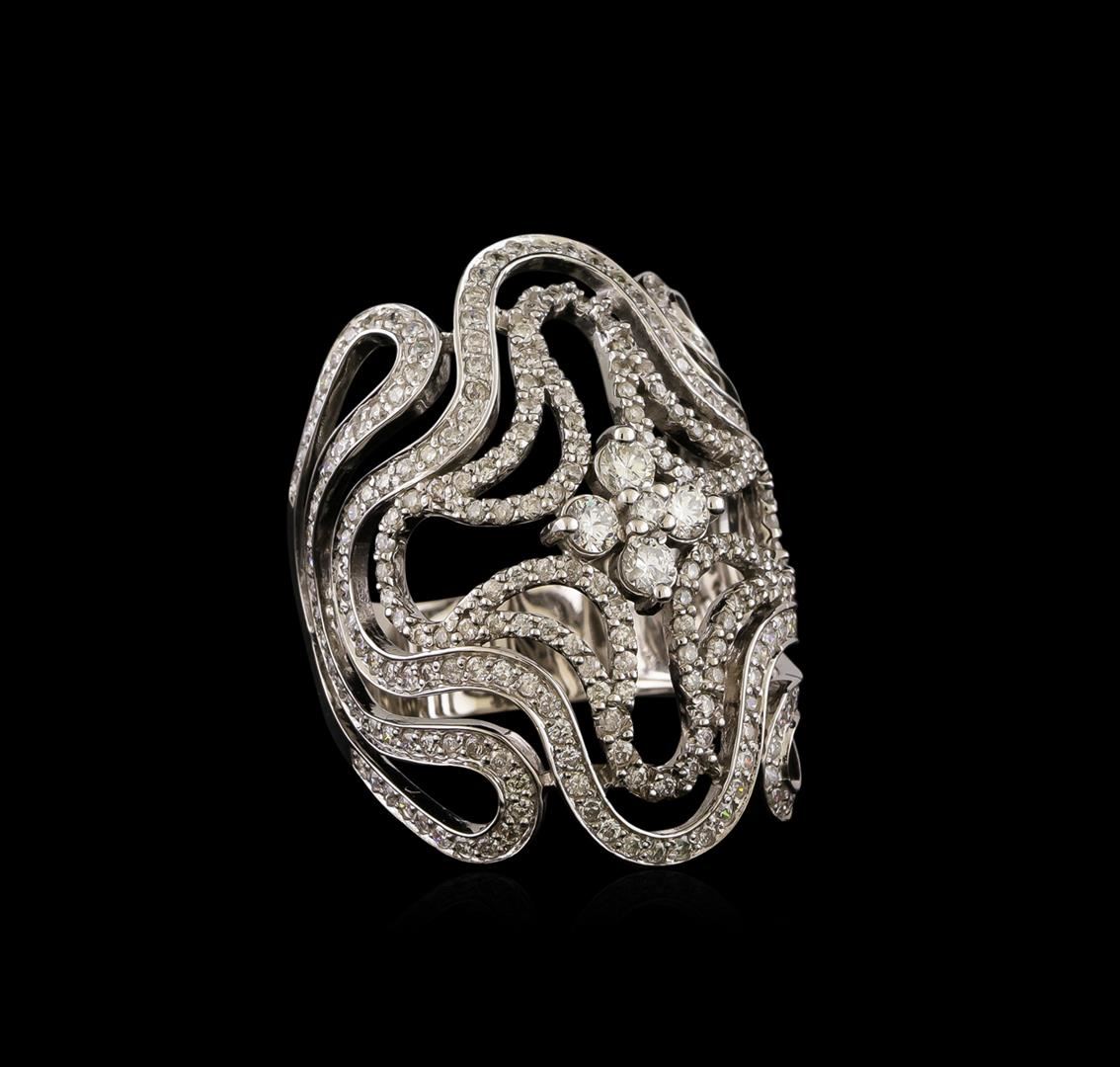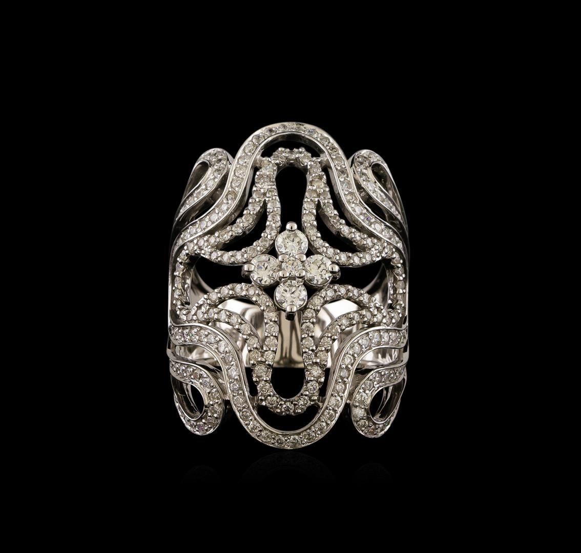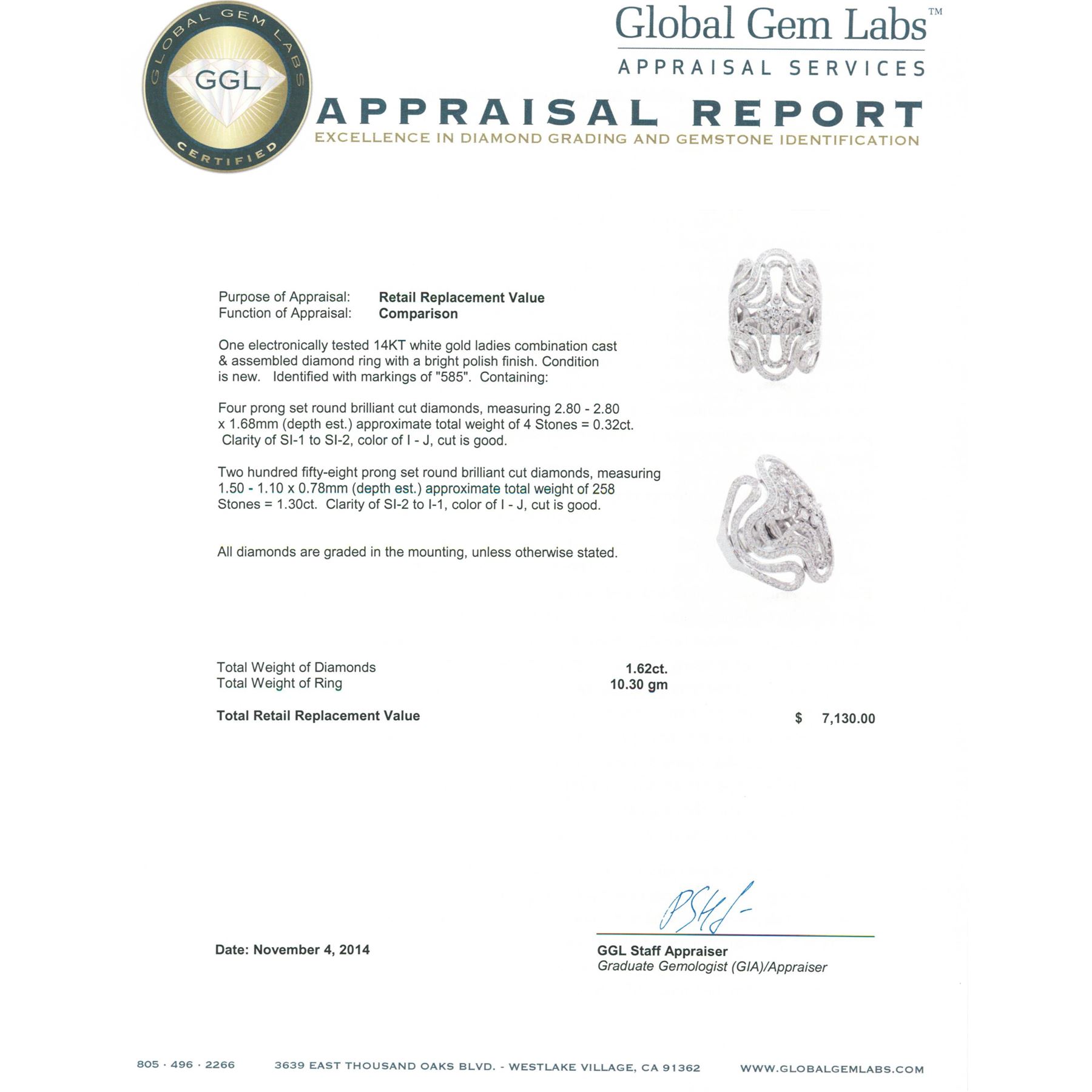 One electronically tested 14KT white gold ladies combination cast & assembled diamond ring with a bright polish finish. Identified with markings of "585". Condition is new. Containing: Four prong set round brilliant cut diamonds, measuring 2.80 - 2.80 x 1.68mm (depth est.) approximate total weight of 4 Stones = 0.32ct. Clarity: SI-1 to SI-2. Color: I - J, Cut is Good. Two Hundred Fifty-Eight prong set round brilliant cut diamonds, measuring 1.50 - 1.10 x 0.78mm (depth est.) approximate total weight of 258 Stones = 1.30ct. Clarity: SI-2 to I-1. Color: I - J, Cut is Good. All diamonds are graded in the mounting, unless otherwise stated. Total Weight of Diamonds 1.62ct. Total Weight of Ring 10.30 grams. GGL Appraised.