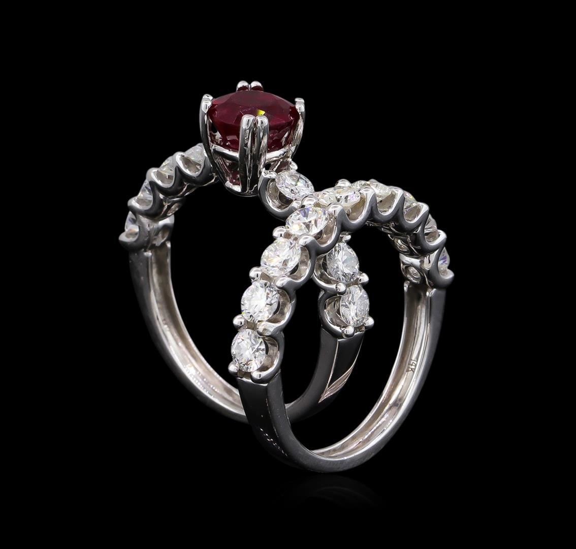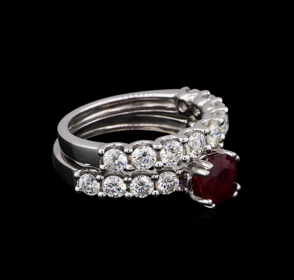 One electronically tested 14KT white gold Ladies combination cast & assembled wedding ring & wedding band with a bright polish finish. Condition is new. Identified with markings of "14K". Containing: Seventeen prong set round brilliant cut diamonds, measuring 3.00 - 3.00 x 1.80mm (depth est.) approximate. Total Weight of 17 Stones = 2.21ct. Clarity: I-1 to I-2. Color: I - J, Cut is Good. One prong set round modified brilliant cut natural ruby, measuring 6.60 - 6.40 x 4.50 mm, exact weight 1.62ct., clarity is heavily included, type II, medium dark, moderately strong, strongly purplish red color, (GIA stpR 6/4), cut is good. Colored gemstones are presumed to have been subjected to commonly used color/clarity enhancement processes. Total Weight of Colored Stones 1.62ct. Total Weight of Diamonds 2.21ct. Total Weight of Ring & Wedding Band 6.90 grams. GGL Appraised at $6,225.00.