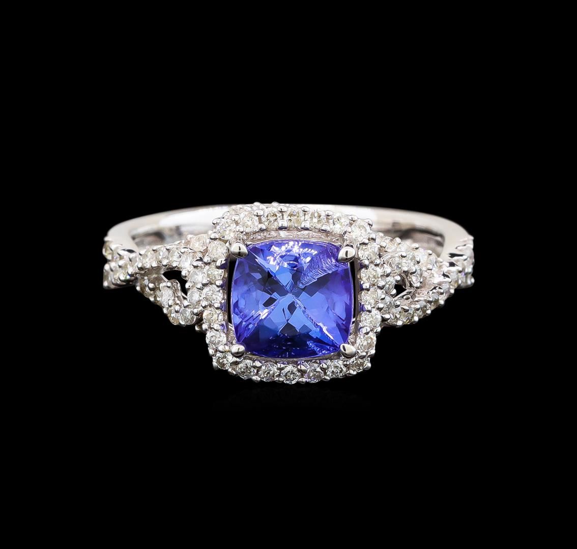 One electronically tested 14KT white gold ladies cast tanzanite and diamond ring with a flat shank with a bright polish finish. Trademark is Orianne. Identified with markings of "14K". Condition is new. Containing: One prong set square cushion modified brilliant cut natural tanzanite, measuring 6.64 x 6.65 x 4.66mm, approximate weight of 1.62ct., clarity is eye clean, type I, medium light, very slightly grayish, violet color, (GIA V 4/3), cut is good. Ninety-Two prong set round brilliant cut diamonds, measuring 1.00 - 1.00 x 0.60mm (depth est.) approximate total weight of 92 Stones = 0.33ct. Clarity: I-1 to I-2. Color: I - J. All diamonds and colored gemstones are graded in the mounting, unless otherwise stated. Colored gemstones are presumed to have been subjected to commonly used enhancement processes.. Total Weight of Colored Stones 1.62ct. Total Weight of Diamonds 0.33ct. Total Weight of Ring 3.50 grams. GGL Appraised at $3,150.00.