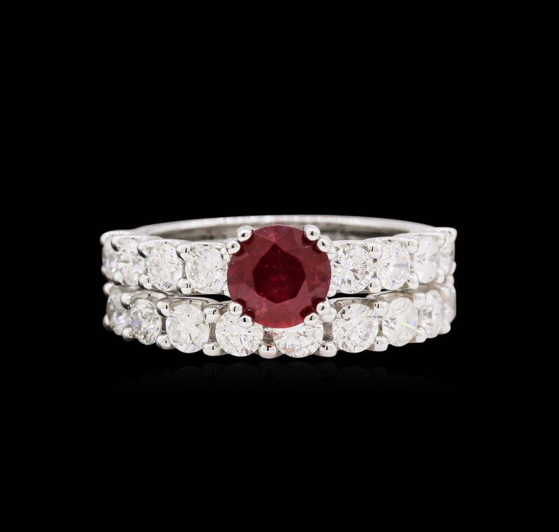 One electronically tested 14KT white gold Ladies combination cast & assembled wedding ring & wedding band with a bright polish finish. Condition is new. Identified with markings of "14K". Containing: Seventeen prong set round brilliant cut diamonds, measuring 3.00 - 3.00 x 1.80mm (depth est.) approximate. Total Weight of 17 Stones = 2.21ct. Clarity: I-1 to I-2. Color: I - J, Cut is Good. One prong set round modified brilliant cut natural ruby, measuring 6.60 - 6.40 x 4.50 mm, exact weight 1.62ct., clarity is heavily included, type II, medium dark, moderately strong, strongly purplish red color, (GIA stpR 6/4), cut is good. Colored gemstones are presumed to have been subjected to commonly used color/clarity enhancement processes. Total Weight of Colored Stones 1.62ct. Total Weight of Diamonds 2.21ct. Total Weight of Ring & Wedding Band 6.90 grams. GGL Appraised at $6,225.00.
