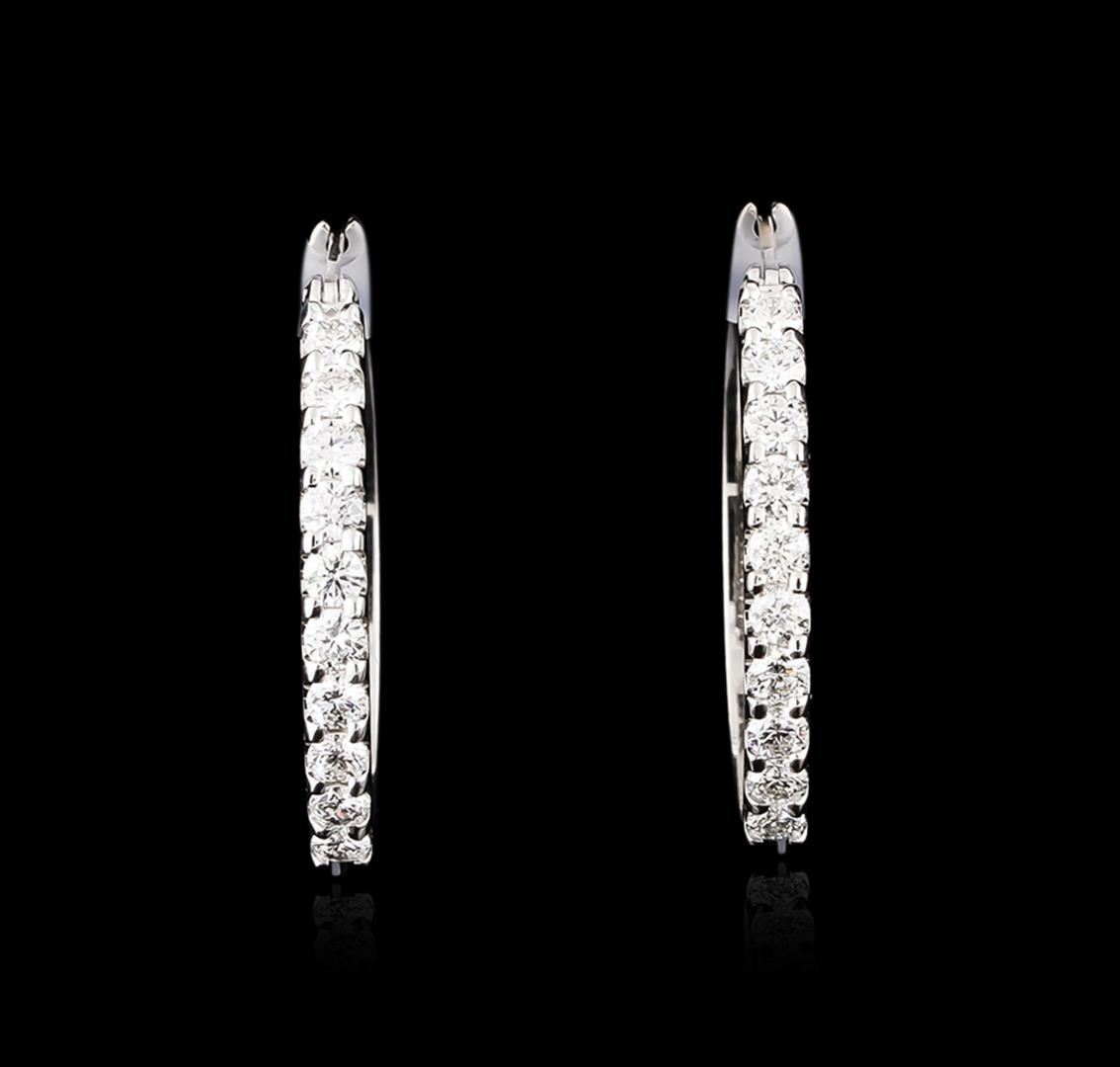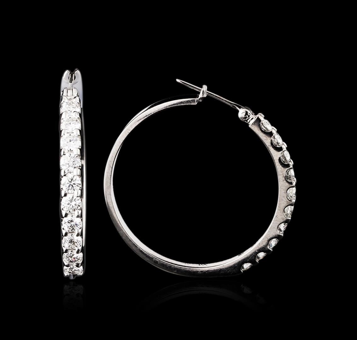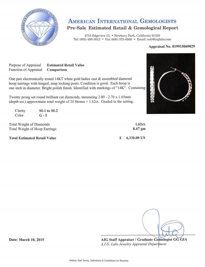 One pair electronically tested 14KT white gold ladies cast & assembled diamond hoop earrings with hinged, snap locking posts. Each hoop is one inch in diameter. Bright polish finish. Identified with markings of "14K". Condition is good. Containing: Twenty prong set round brilliant cut diamonds, measuring 2.80 - 2.70 x 1.65mm (depth est.) approximate total weight of 20 Stones = 1.62ct. Graded in the setting. Clarity: SI-1 to SI-2. Color: G - I. Total Weight of Diamonds 1.62ct. Total Weight of Hoop Earrings 8.47 grams. AIG Appraised at $6,330.00.