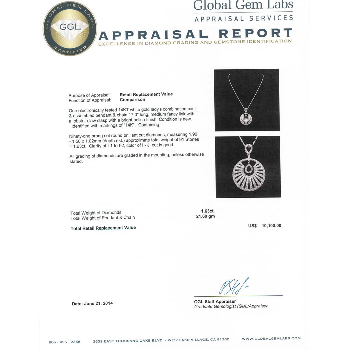 One electronically tested 14KT white gold Ladies combination cast & assembled pendant & chain 17.0" long, medium fancy link with a lobster claw clasp with a bright polish finish. Condition is new. Identified with markings of "14K". Containing: Ninety-One prong set round brilliant cut diamonds, measuring 1.90 - 1.50 x 1.02mm (depth est.) approximate. Total Weight of 91 Stones = 1.63ct. Clarity: I-1 to I-2. Color: I - J, Cut is Good. All grading of diamonds and colored gemstones in this piece of jewelry are graded in the mounting, unless otherwise stated. Total Weight of Diamonds 1.63ct. Total Weight of Pendant & Chain 21.60 grams. GGL Appraised at $10,100.00.