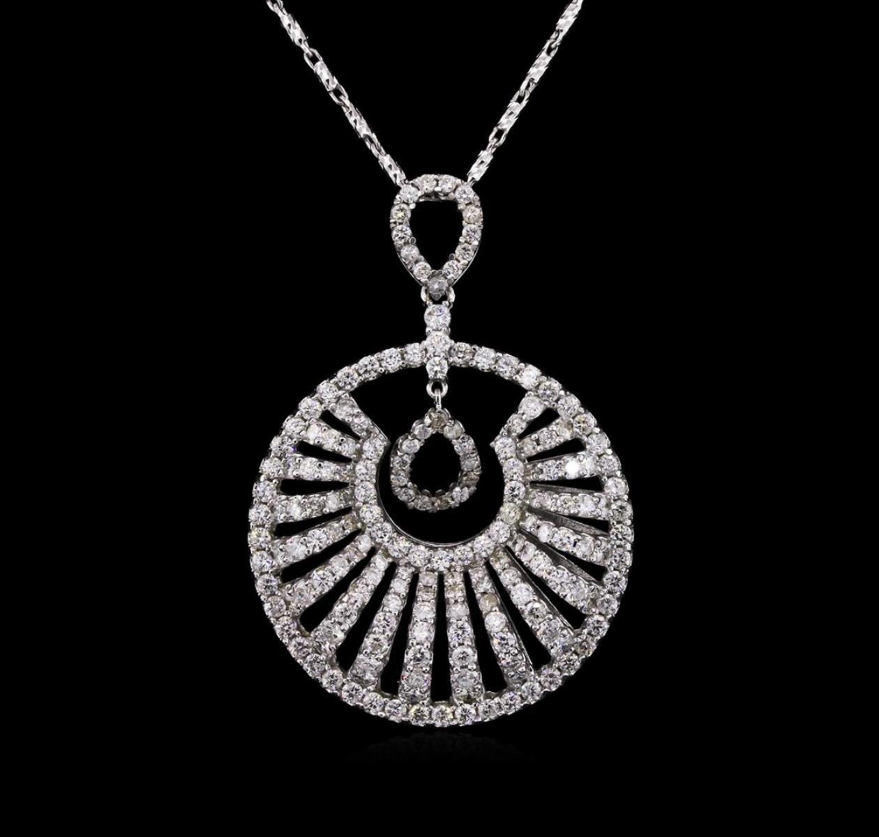 One electronically tested 14KT white gold Ladies combination cast & assembled pendant & chain 17.0" long, medium fancy link with a lobster claw clasp with a bright polish finish. Condition is new. Identified with markings of "14K". Containing: Ninety-One prong set round brilliant cut diamonds, measuring 1.90 - 1.50 x 1.02mm (depth est.) approximate. Total Weight of 91 Stones = 1.63ct. Clarity: I-1 to I-2. Color: I - J, Cut is Good. All grading of diamonds and colored gemstones in this piece of jewelry are graded in the mounting, unless otherwise stated. Total Weight of Diamonds 1.63ct. Total Weight of Pendant & Chain 21.60 grams. GGL Appraised.