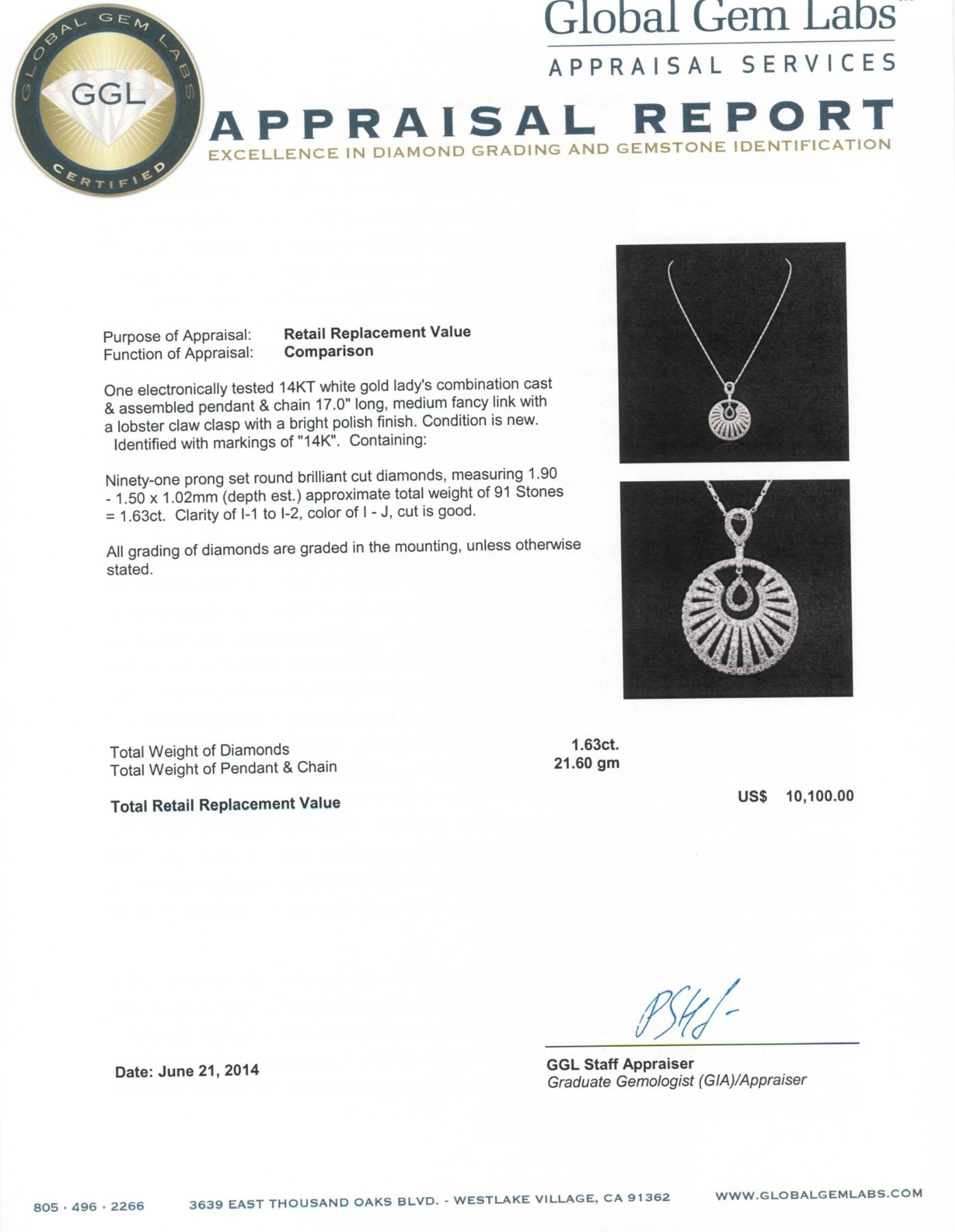 One electronically tested 14KT white gold Ladies combination cast & assembled pendant & chain 17.0" long, medium fancy link with a lobster claw clasp with a bright polish finish. Condition is new. Identified with markings of "14K". Containing: Ninety-One prong set round brilliant cut diamonds, measuring 1.90 - 1.50 x 1.02mm (depth est.) approximate. Total Weight of 91 Stones = 1.63ct. Clarity: I-1 to I-2. Color: I - J, Cut is Good. All grading of diamonds and colored gemstones in this piece of jewelry are graded in the mounting, unless otherwise stated. Total Weight of Diamonds 1.63ct. Total Weight of Pendant & Chain 21.60 grams. GGL Appraised.