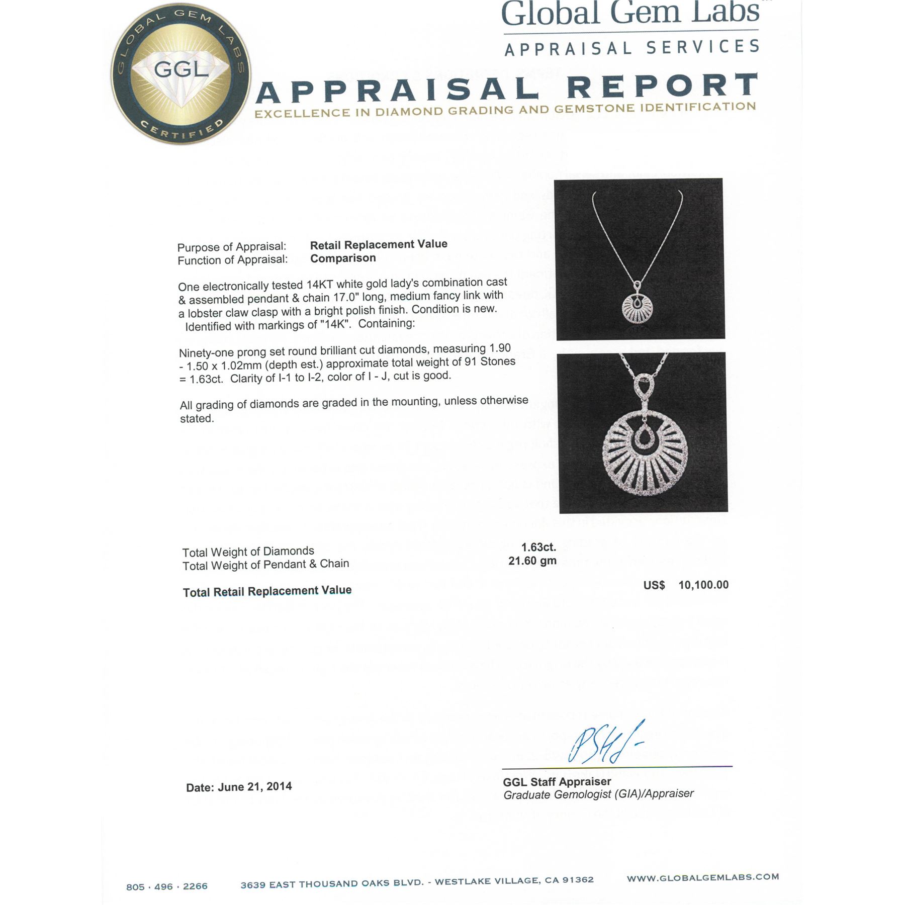 One electronically tested 14KT white gold Ladies combination cast & assembled pendant & chain 17.0" long, medium fancy link with a lobster claw clasp with a bright polish finish. Condition is new. Identified with markings of "14K". Containing: Ninety-One prong set round brilliant cut diamonds, measuring 1.90 - 1.50 x 1.02mm (depth est.) approximate. Total Weight of 91 Stones = 1.63ct. Clarity: I-1 to I-2. Color: I - J, Cut is Good. All grading of diamonds and colored gemstones in this piece of jewelry are graded in the mounting, unless otherwise stated. Total Weight of Diamonds 1.63ct. Total Weight of Pendant & Chain 21.60 grams. GGL Appraised.