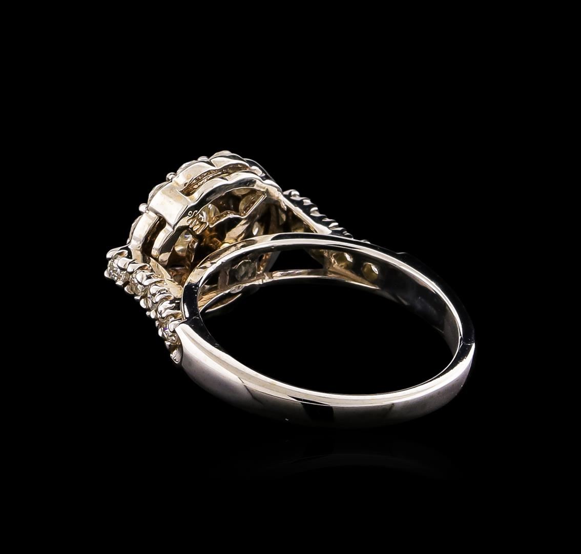 One electronically tested 14KT white gold ladies cast diamond unity ring with a bright polish finish. Condition is new, good workmanship. The featured diamond is set within a diamond bezel supported by diamond set shoulders, completed by a two millimeter wide band. Identified with markings of "585". Containing: One prong set round brilliant cut diamond, measuring 5.75 - 5.70 x 4.00mm (depth est.) approximate weight of 0.84ct with a medium blue fluorescence. Graded in the setting. Clarity: I-2. Color: 69.8%. Table 55.9%. Twenty-Two prong set round brilliant cut diamonds, measuring 2.30 - 2.00 x 1.29mm (depth est.) approximate. Total Weight of 22 Stones = 0.79ct. Graded in the setting. Clarity: SI-1 to I-1. Color: G - I. Total Weight of Diamonds 1.63ct. Total Weight of Ring 4.62 grams. AIG Appraised at $7,300.00.