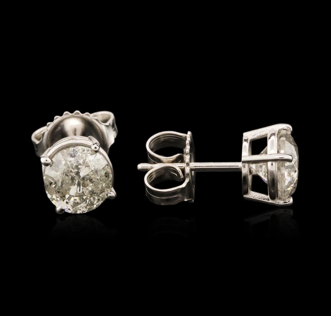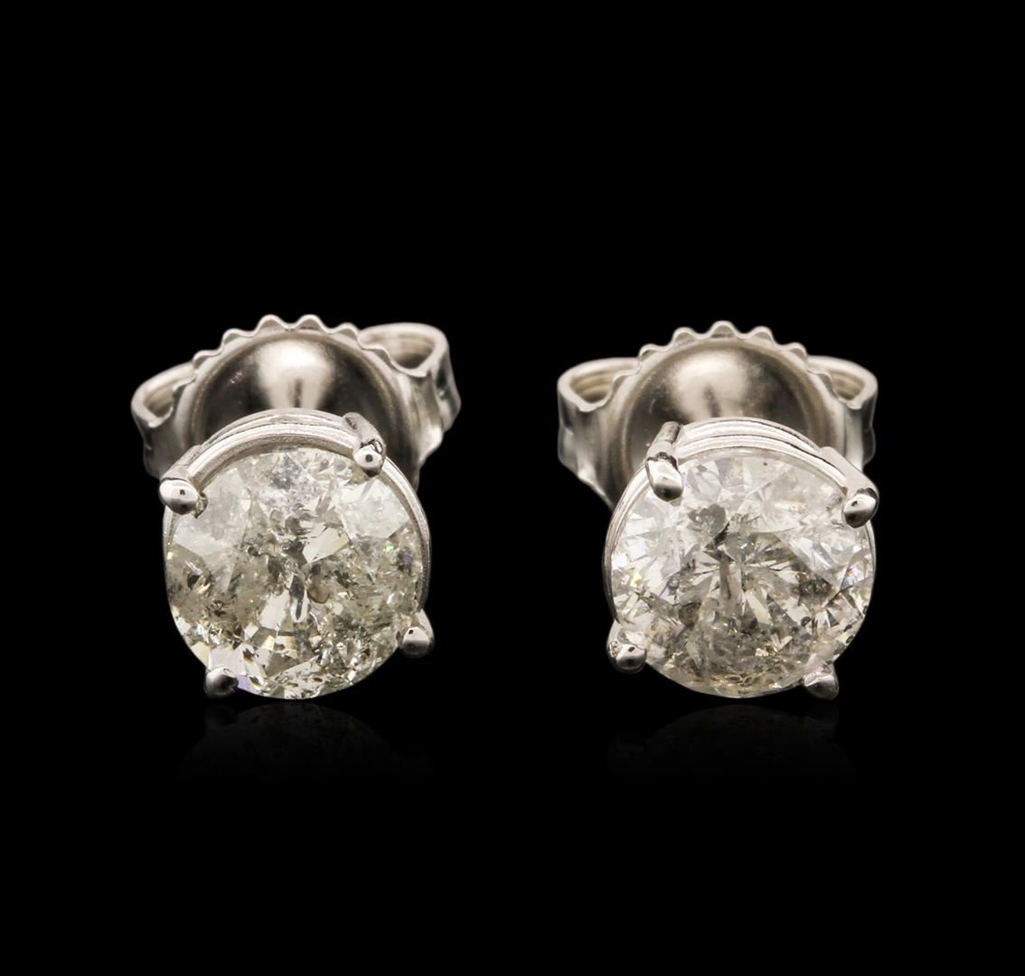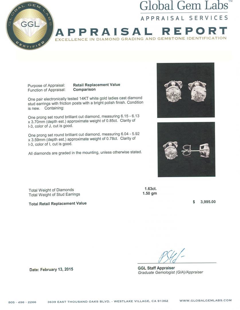 One pair electronically tested 14KT white gold ladies cast diamond stud earrings with friction posts with a bright polish finish. Condition is new. Containing: One prong set round brilliant cut diamond, measuring 6.15 - 6.13 x 3.70mm (depth est.) approximate weight of 0.85ct. Clarity: I-3. Color: J, Cut is Good. One prong set round brilliant cut diamond, measuring 6.04 - 5.92 x 3.59mm (depth est.) approximate weight of 0.78ct. Clarity: I-3. Color: I, Cut is Good. All diamonds are graded in the mounting, unless otherwise stated. Total Weight of Diamonds 1.63ct. Total Weight of Stud Earrings 1.50 grams. GGL Appraised at $3,995.00.