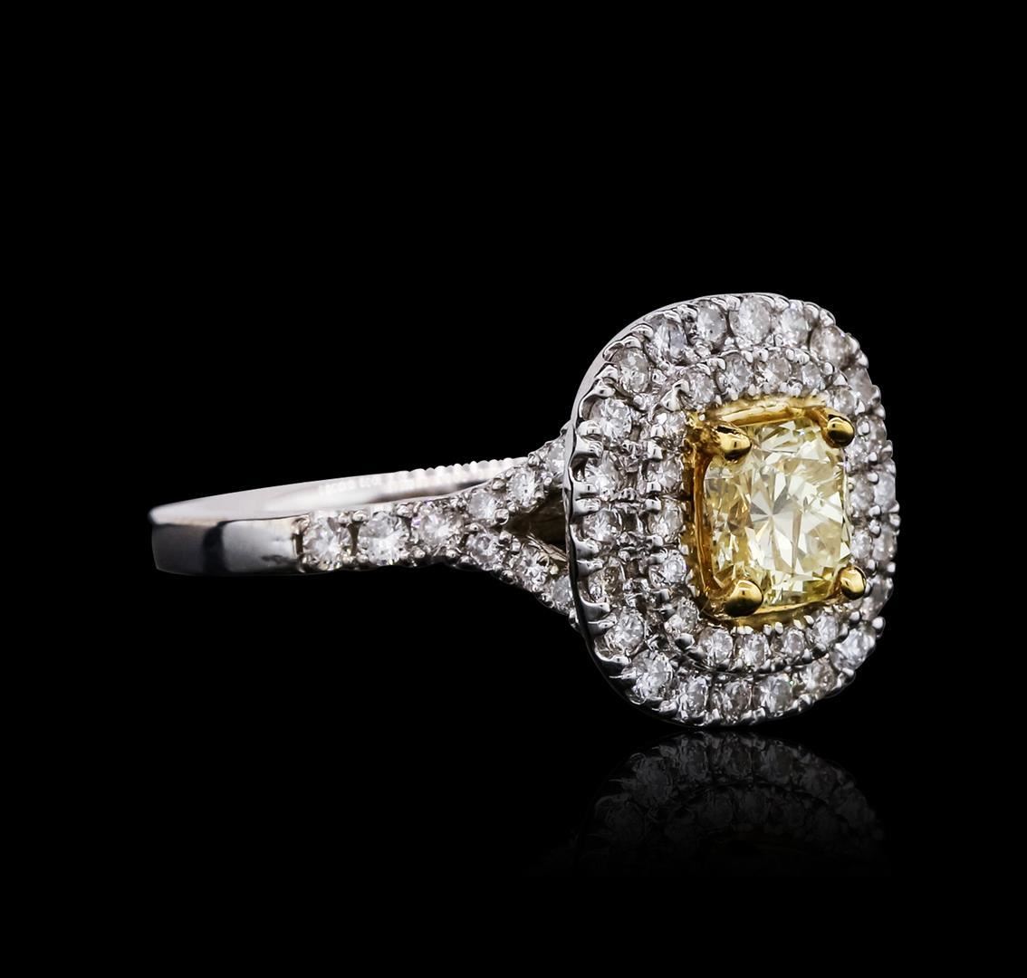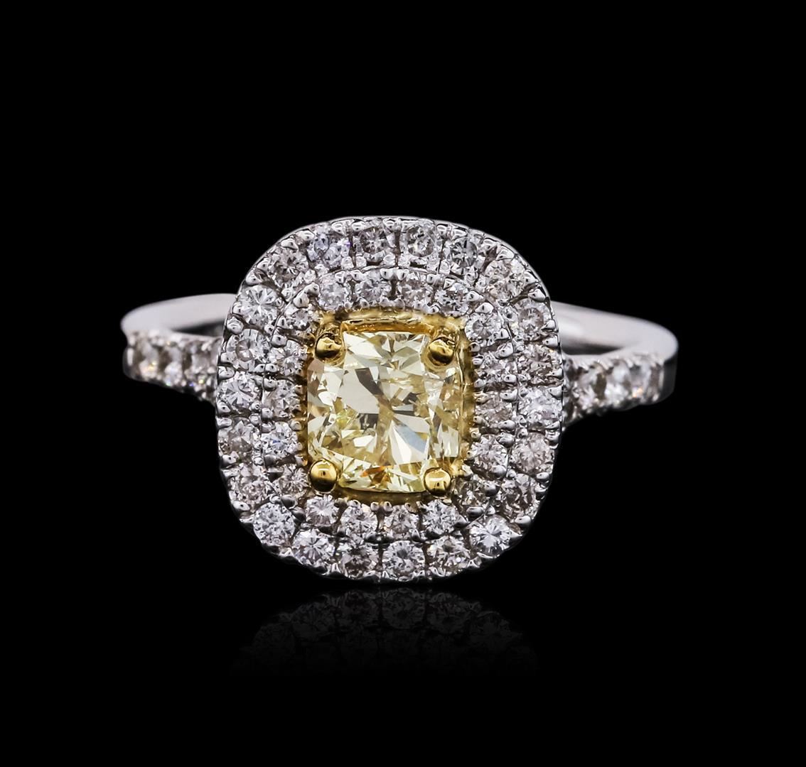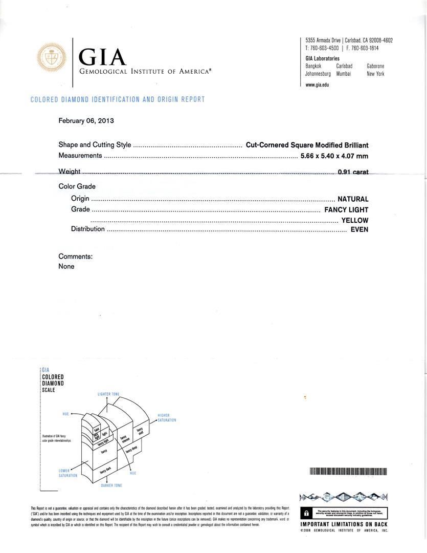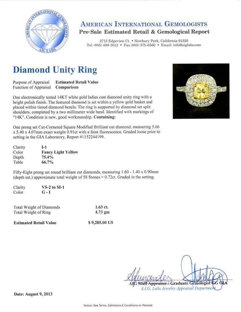 Great Condition! JJ1053WT. One electronically tested 14KT white gold ladies cast diamond unity ring with a bright polish finish. The featured diamond is set within a yellow gold basket and placed within tiered diamond bezels. The ring is supported by diamond set split shoulders, completed by a two millimeter wide band. Identified with markings of "14K". Condition is new, good workmanship. Containing: One prong set Cut-Cornered Square Modified Brilliant cut diamond, measuring 5.66 x 5.40 x 4.07mm exact weight 0.91ct with a faint fluorescence. Graded loose prior to setting in the GIA Laboratory, Report #1152244199. Clarity I-1. Color Fancy Light Yellow. Depth 75.4%. Table 66.7%. Fifty-Eight prong set round brilliant cut diamonds, measuring 1.60 - 1.40 x 0.90mm (depth est.) approximate total weight of 58 Stones = 0.72ct. Graded in the setting. Clarity VS-2 to SI-1. Color G - I. Total Weight of Diamonds 1.63 ct. Total Weight of Ring 4.73gm. AIG Appraised at $9,285.00. GIA Appraised.