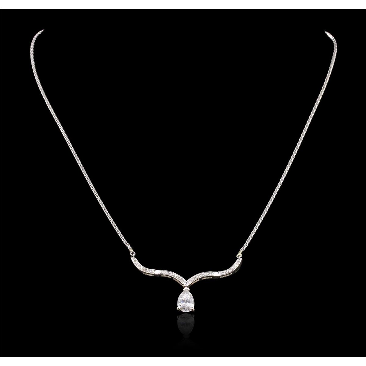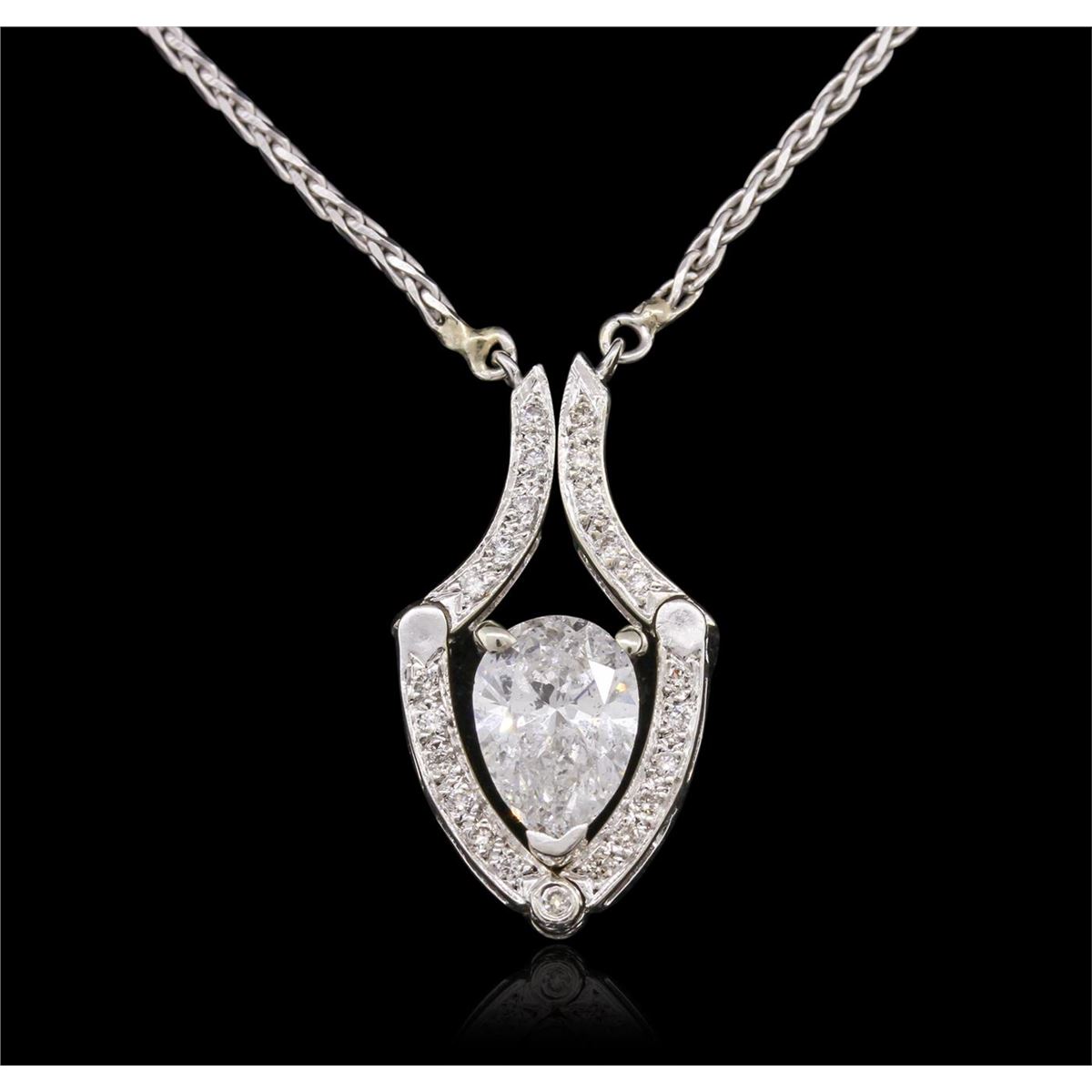 One electronically tested 14KT white gold ladies cast & assembled diamond pendant with chain. Condition is good. The pendant features the ability to be worn in two different ways. The first design features a pear shaped diamond set within a stylized diamond frame. While the second design features a ridged diamond set chevron design with a pear shaped diamond dangle. The pendant is supported by an attached sixteen inch length 14KT white gold designer style wheat chain, terminating in a spring ring clasp. Bright polish finish with milgrain detailing. Identified with markings of "14K". Containing: One prong set pear shaped cut diamond, measuring 9.30 x 6.35 x 3.78mm (depth est.) approximate weight of 1.43ct, laser drilled with a medium blue fluorescence. Graded in the setting. Clarity: I-1. Color: G Depth 59.5%. Table 58.3%. Twenty-Three bead & bezel set round brilliant cut diamonds, measuring 1.20 - 1.10 x 0.69mm (depth est.) approximate. Total Weight of 23 Stones = 0.20ct. Graded in the setting. Clarity: VS-1 to VS-2. Color: G - I. Total Weight of Diamonds 1.63ct. Total Weight of Pendant With Chain 7.38 grams. AIG Appraised at $15,625.00.