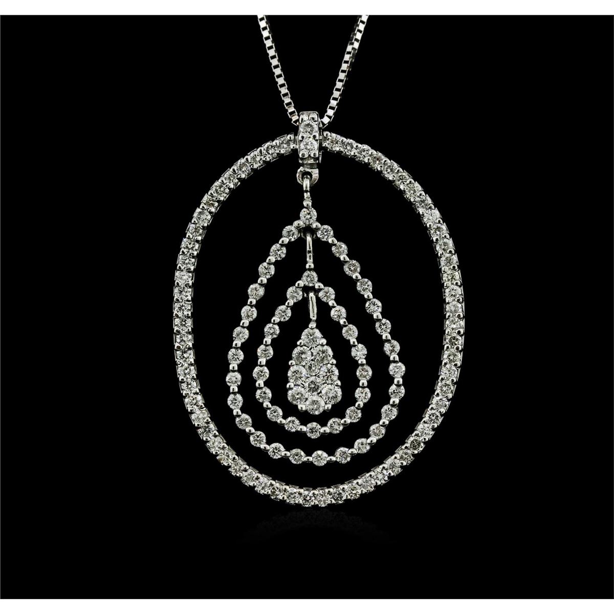 One electronically tested 14KT white gold ladies cast diamond pendant & chain 16.0" long, box link with a lobster claw clasp with a bright polish finish. Measurements: 16" in length Identified with markings of "14K". Condition is new. Containing: One Hundred Ten prong set round brilliant cut diamonds, measuring 1.90 - 1.30 x 0.96mm (depth est.) approximate total weight of 110 Stones = 1.64ct. Clarity: SI-2 to I-1. Color: I - J, Cut is Good. All diamonds are graded in the mounting, unless otherwise stated. Total Weight of Diamonds 1.64ct. Total Weight of Pendant & Chain 8.90 grams. GGL Appraised at $4,770.00.