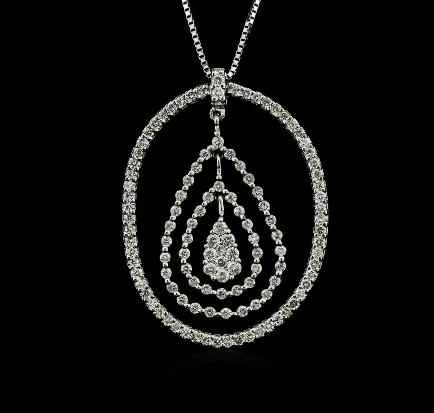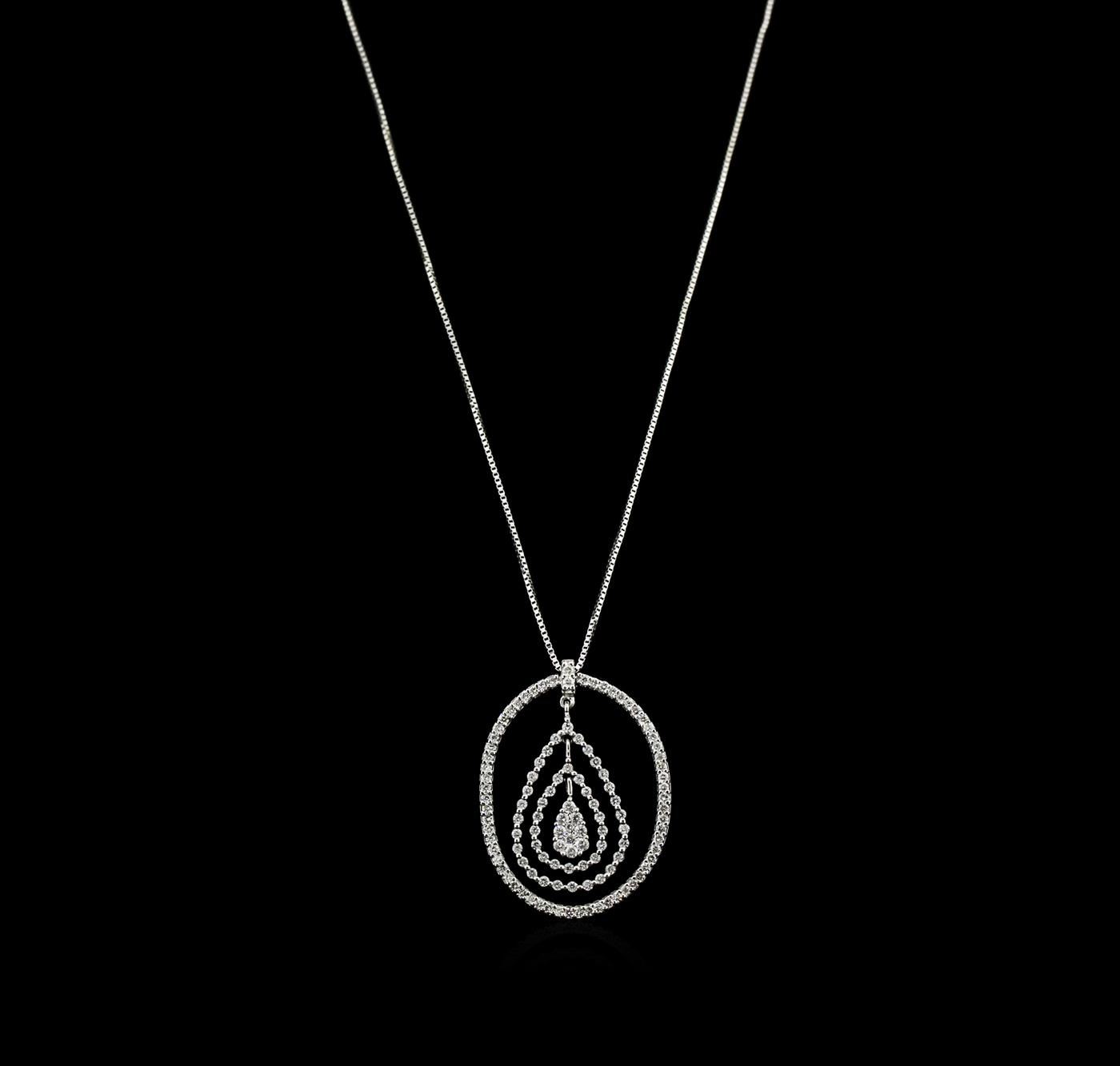 One electronically tested 14KT white gold ladies cast diamond pendant & chain 16.0" long, box link with a lobster claw clasp with a bright polish finish. Measurements: 16" in length Identified with markings of "14K". Condition is new. Containing: One Hundred Ten prong set round brilliant cut diamonds, measuring 1.90 - 1.30 x 0.96mm (depth est.) approximate total weight of 110 Stones = 1.64ct. Clarity: SI-2 to I-1. Color: I - J, Cut is Good. All diamonds are graded in the mounting, unless otherwise stated. Total Weight of Diamonds 1.64ct. Total Weight of Pendant & Chain 8.90 grams. GGL Appraised at $4,770.00.