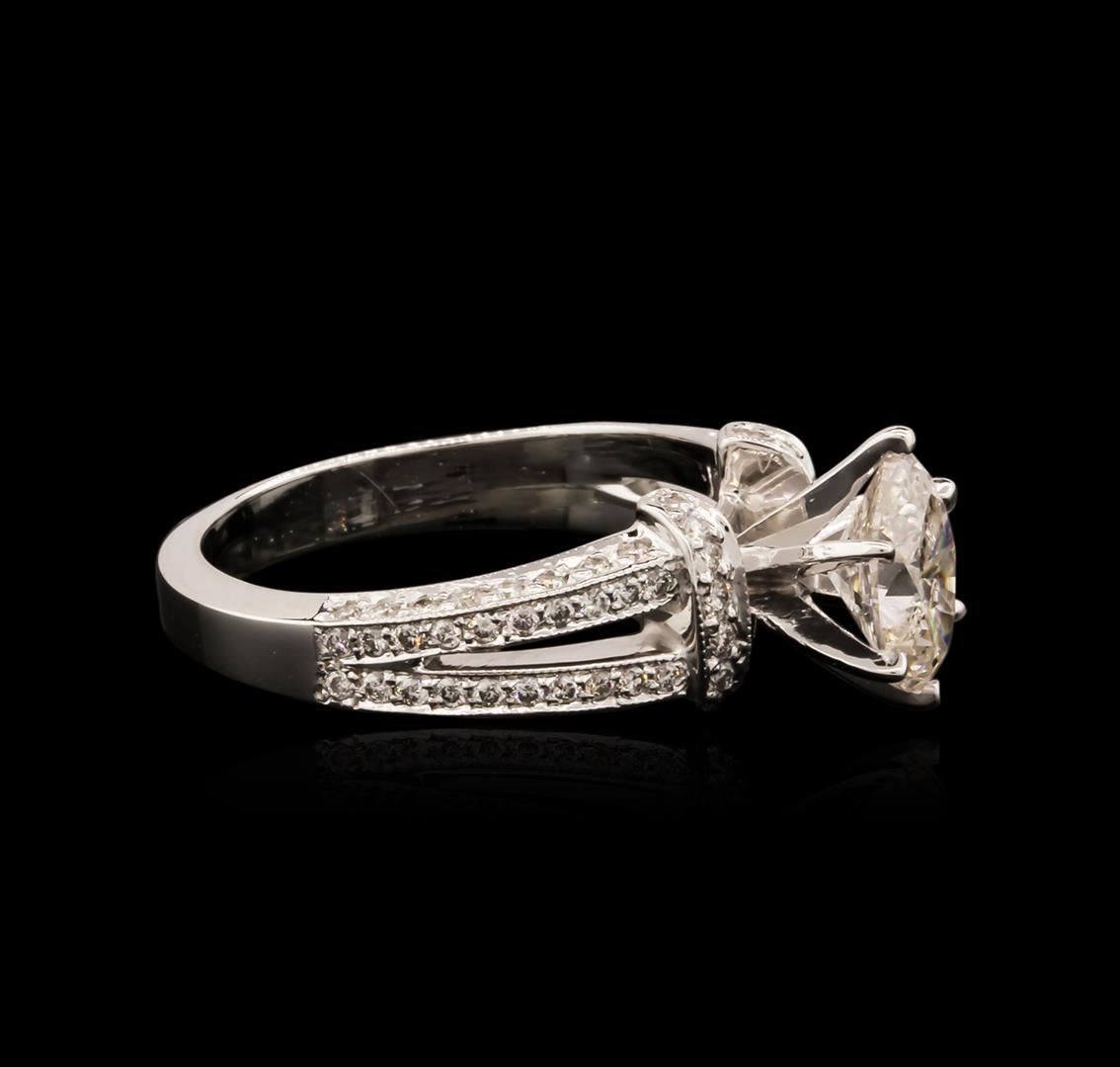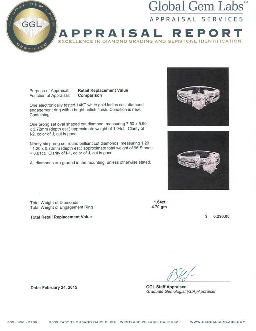 One electronically tested 14KT white gold ladies cast diamond engagement ring with a bright polish finish. Condition is new. Containing: One prong set oval shaped cut diamond, measuring 7.50 x 5.90 x 3.72mm (depth est.) approximate weight of 1.04ct. Clarity: I-2. Color: J, Cut is Good. Ninety-Six prong set round brilliant cut diamonds, measuring 1.20 - 1.20 x 0.72mm (depth est.) approximate total weight of 96 Stones = 0.61ct. Clarity: I-1. Color: J, Cut is Good. All diamonds are graded in the mounting, unless otherwise stated. Total Weight of Diamonds 1.64ct. Total Weight of Engagement Ring 4.70 grams. GGL Appraised at $6,290.00.